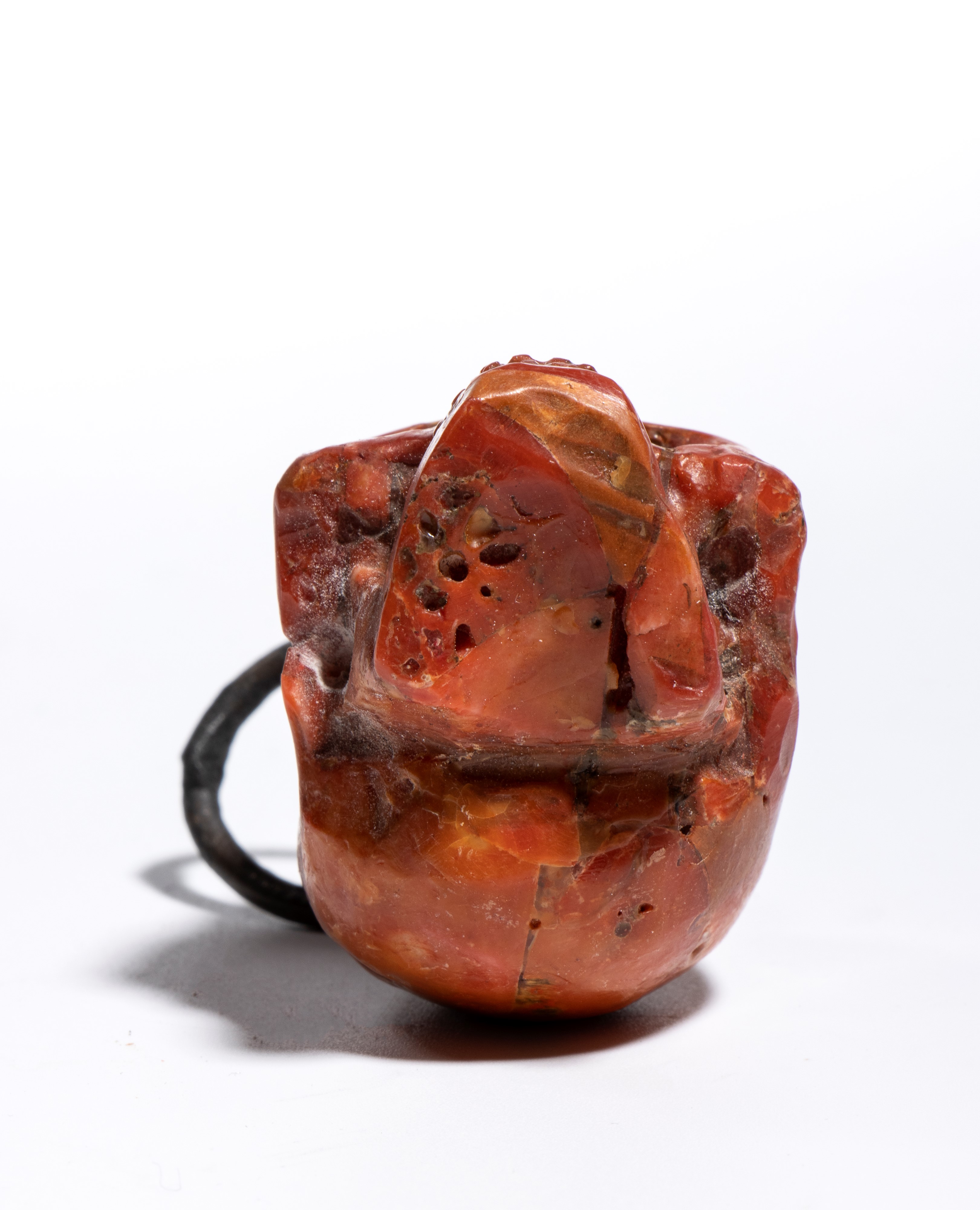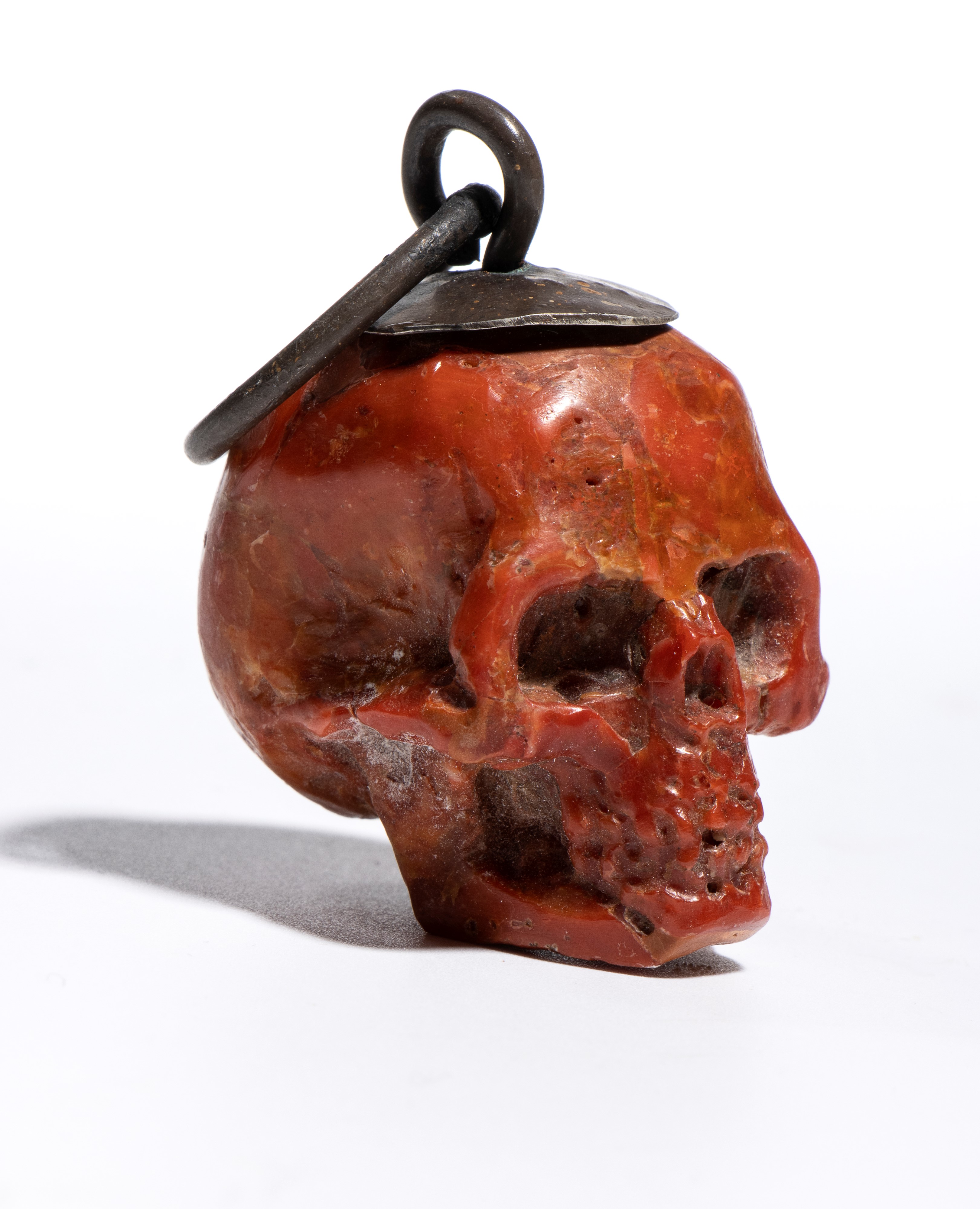 La scultura è accurata e presenta un buon livello di dettaglio. Sulla sommità del teschio è applicato un gancio da cui parte un anello dello stesso materiale, pensato per permettere l’uso come pendente o amuleto. È anche possibile interpretare questo pendente come un memento mori, cioè un oggetto simbolico che invita alla consapevolezza della mortalità umana. I memento mori erano diffusi già nel Medioevo e nel Rinascimento e venivano utilizzati per ricordare la caducità della vita, spronando a vivere con saggezza, virtù o spiritualità. Il simbolo del teschio era tra i più comuni: rappresentava la transitorietà dell’esistenza e il valore del tempo. Anche oggi, in contesti artistici o personali, un teschio indossato come gioiello può mantenere questo significato meditativo, oltre a quello estetico.