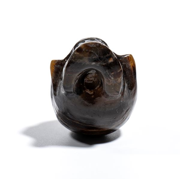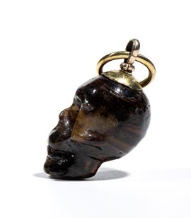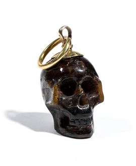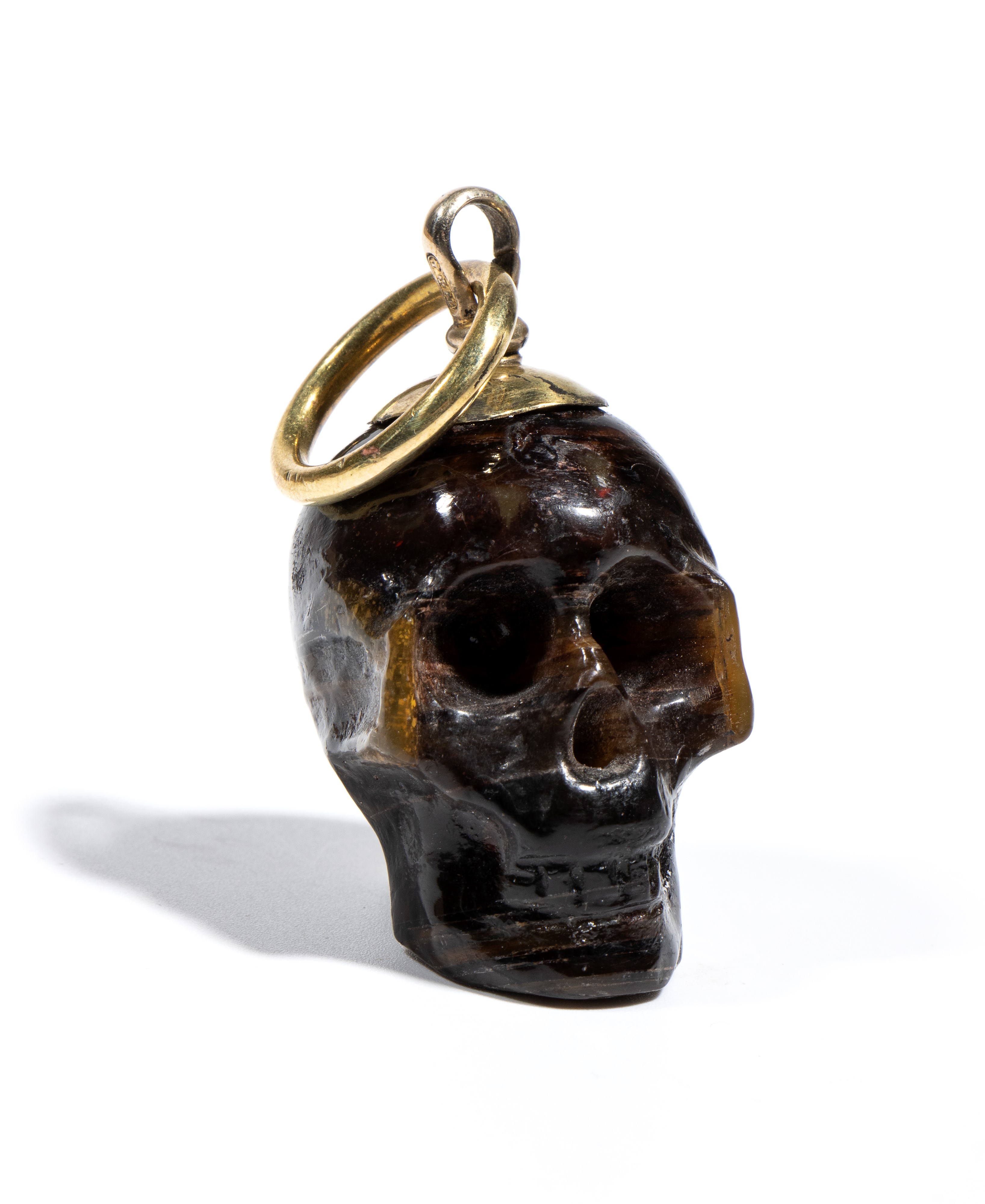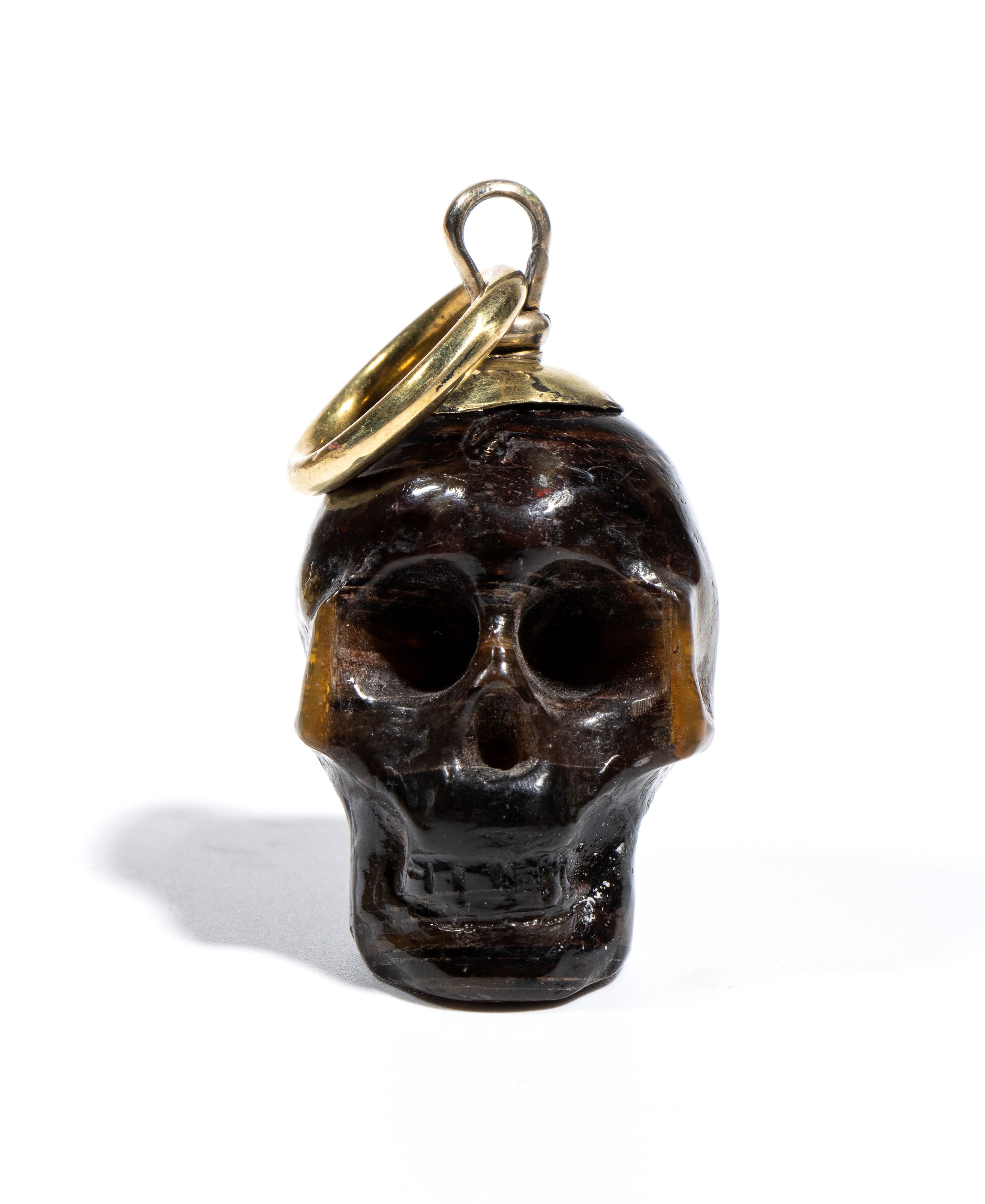 La scultura è accurata e presenta un buon livello di dettaglio. Sulla sommità del teschio è applicato un gancio in oro basso titolo da cui parte un anello dello stesso materiale, pensato per permettere l’uso come pendente o amuleto. È anche possibile interpretare questo pendente come un memento mori, cioè un oggetto simbolico che invita alla consapevolezza della mortalità umana. I memento mori erano diffusi già nel Medioevo e nel Rinascimento e venivano utilizzati per ricordare la caducità della vita, spronando a vivere con saggezza, virtù o spiritualità. Il simbolo del teschio era tra i più comuni: rappresentava la transitorietà dell’esistenza e il valore del tempo. Anche oggi, in contesti artistici o personali, un teschio indossato come gioiello può mantenere questo significato meditativo, oltre a quello estetico.