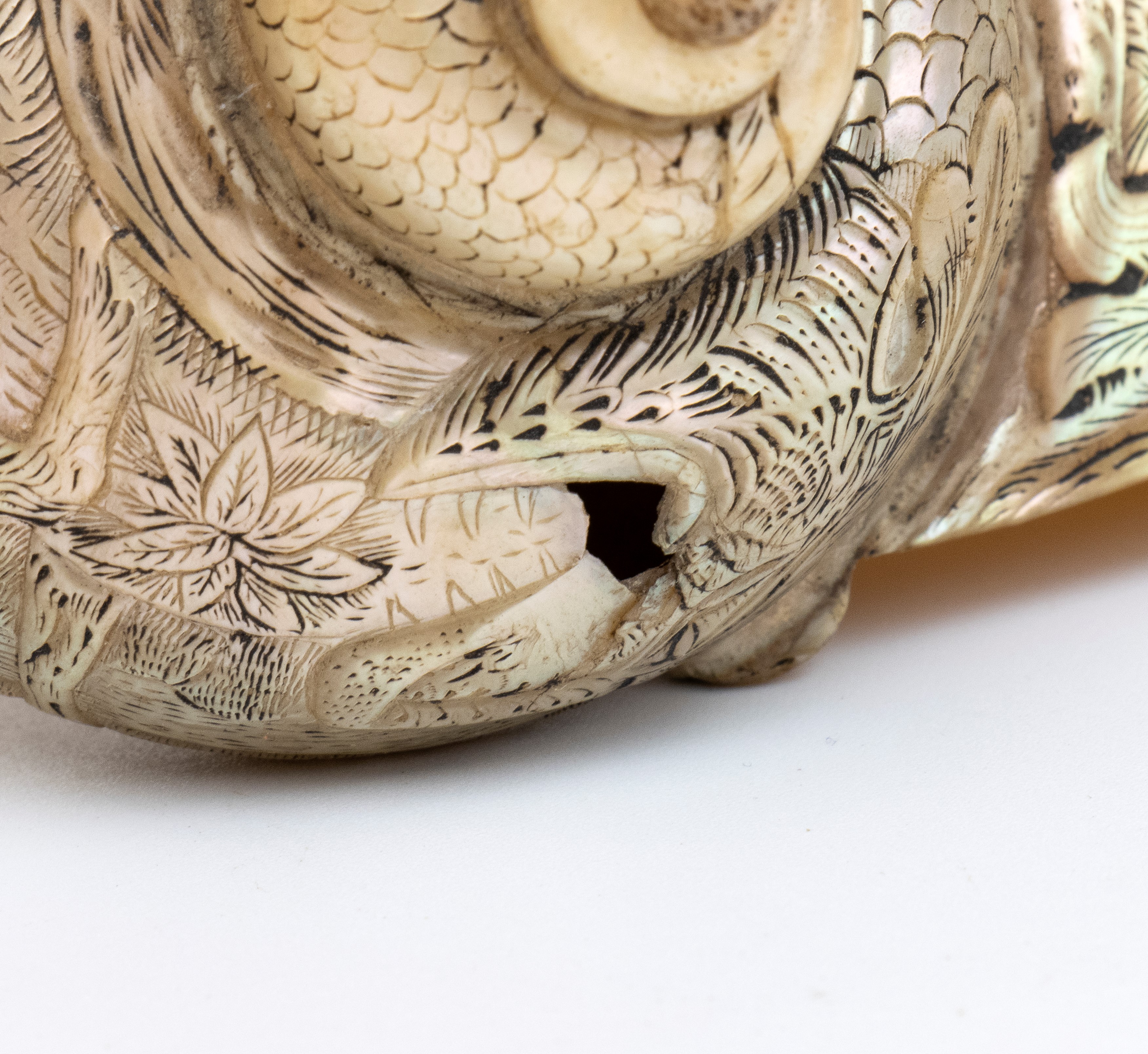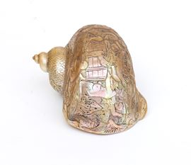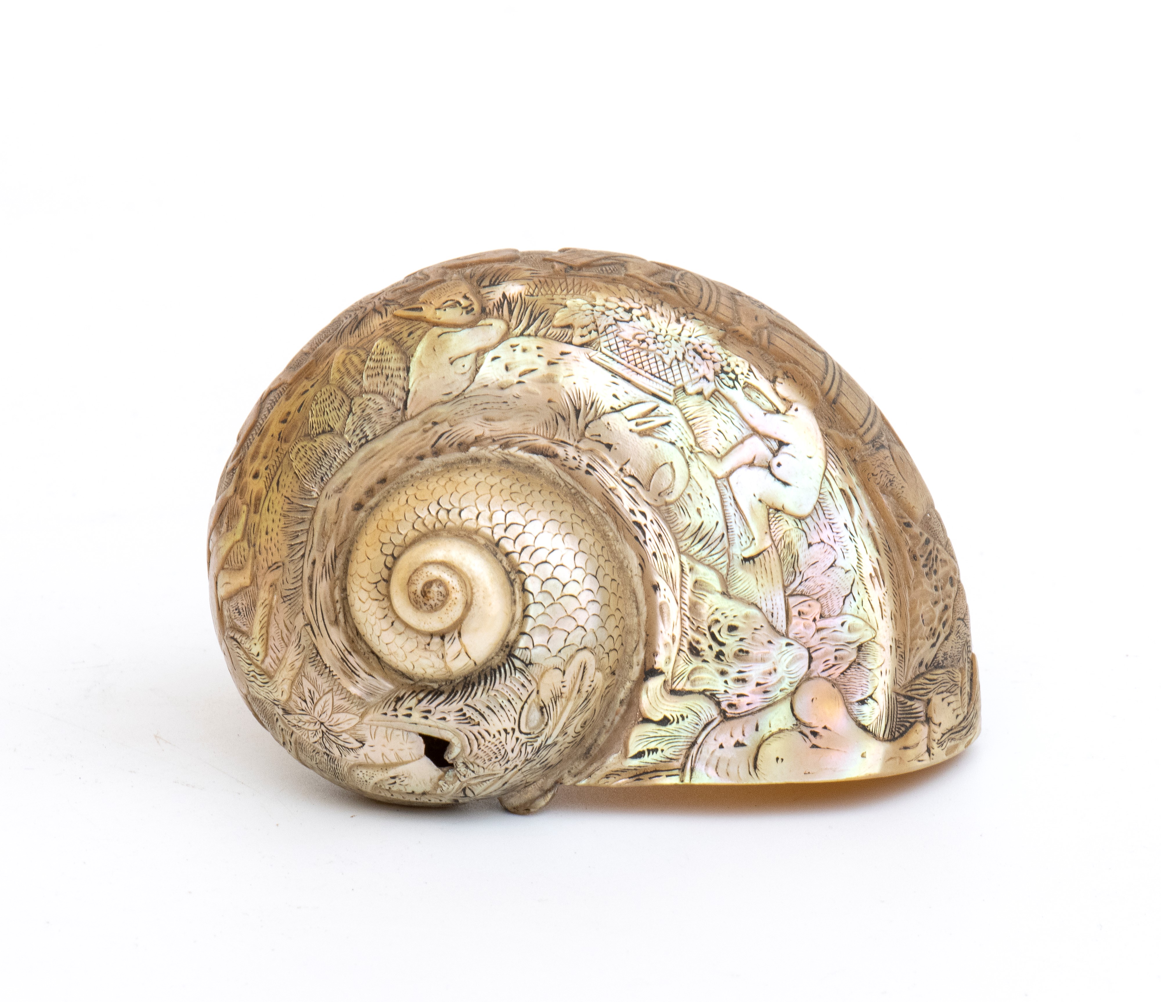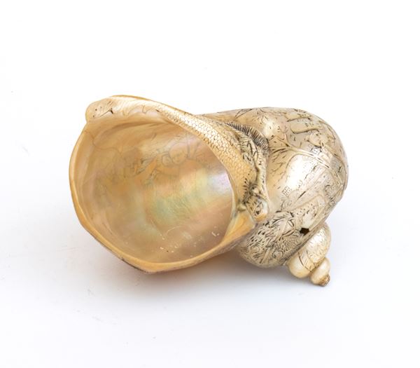 finemente incisa e decorata con un paesaggio animato da figure impegnate in attività quotidiane, circondate da animali e vegetazione. L’accuratezza del tratto e la ricchezza dei dettagli riflettono la maestria delle botteghe asiatiche ottocentesche specializzate nella lavorazione decorativa di conchiglie destinate all’esportazione verso l’Europa come oggetti d’arte e curiosità naturalistiche.