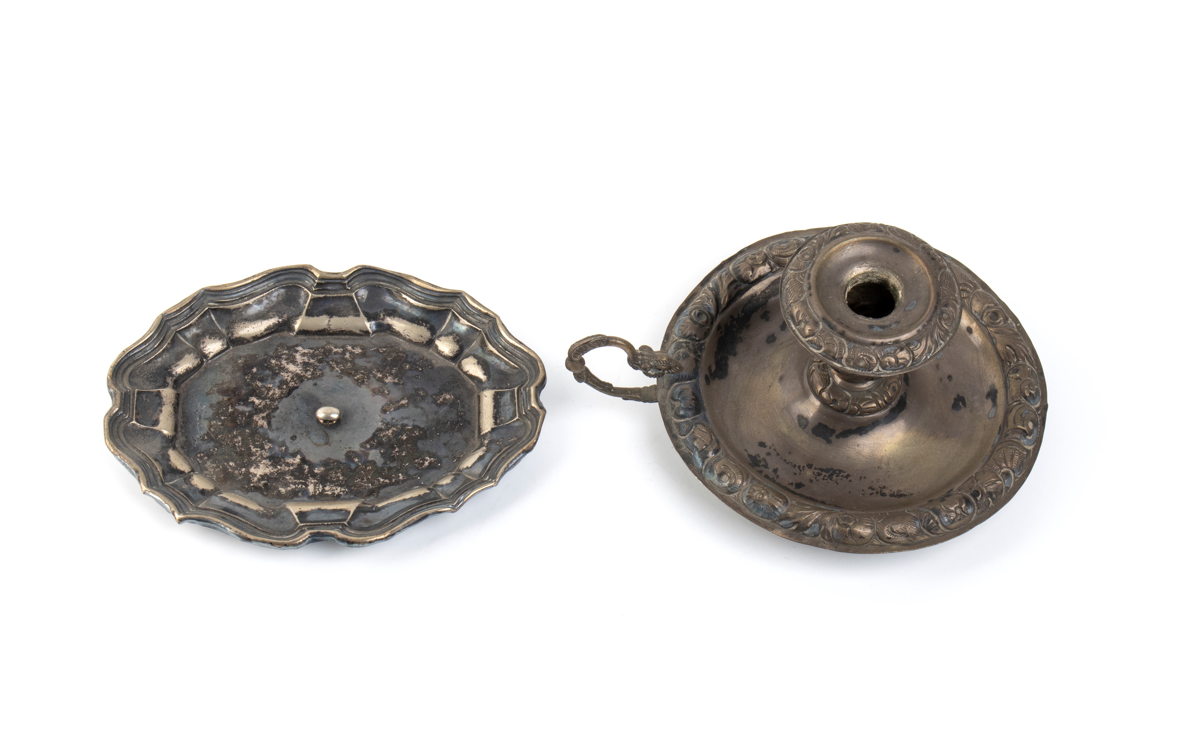 La bugia presenta un fusto sbalzato con decorazioni a motivi vegetali e una base circolare con bordo elaborato. È dotata di un manico laterale per la presa. Il vassoietto, di forma allungata e bordo sagomato, è caratterizzato da una decorazione a rilievo che ne segue il perimetro.