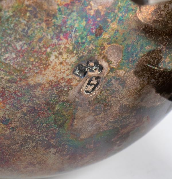 poggiante su tre piedini leonini stilizzati, di forma rotonda, decorata con motivi vegetali e geometrici, con presa a forma di ghianda.