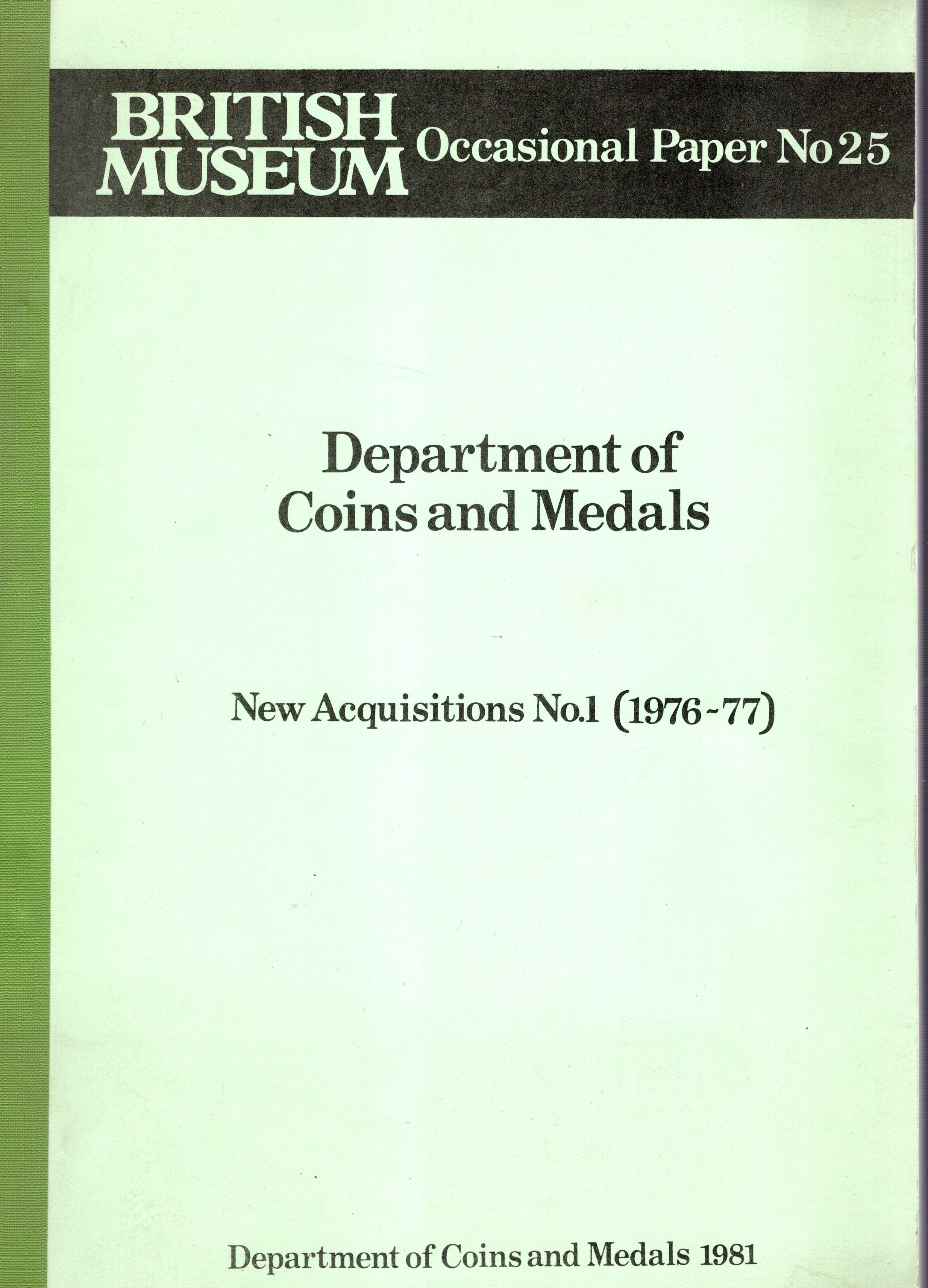 AA.-VV. - Department of Coins and Medals. New acquisitions n 1( 1976- 77) London, 1981. pp 151, tavole 41. Brossura ed. dorso sciupato, interno ottimo stato, importante documentazione di monete greche, romane, celtiche, orientali, medaglie..