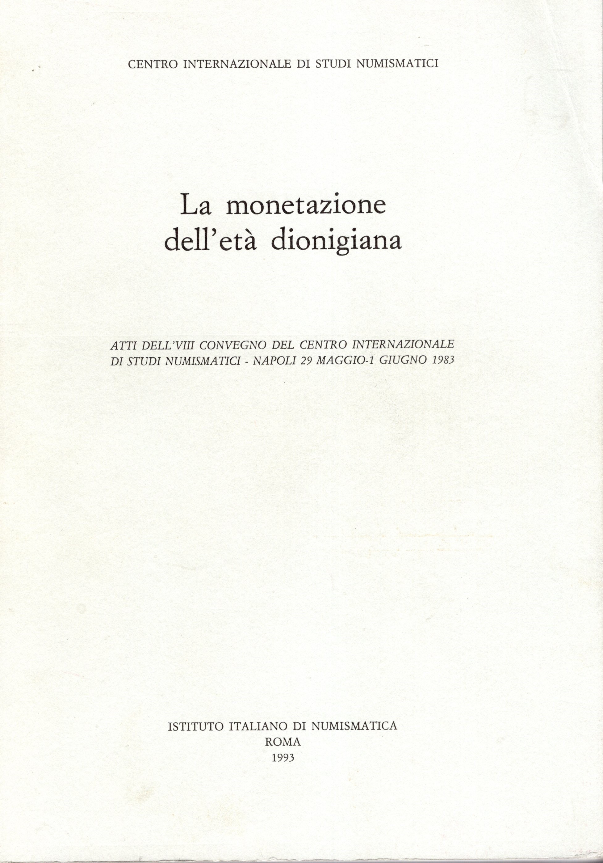 AA. VV. - Lamonetazione dell età dionigiana. Atti dell VIII convegno del Centro Internazionale di studi numismatici. Napoli 29 - Maggio - 1 Giugno 1983. Roma, 1993. pp. xvi + 339, tavole. 20. rilegatura editoriale, ottimo stato, importante. Ruotolo, pag. 20