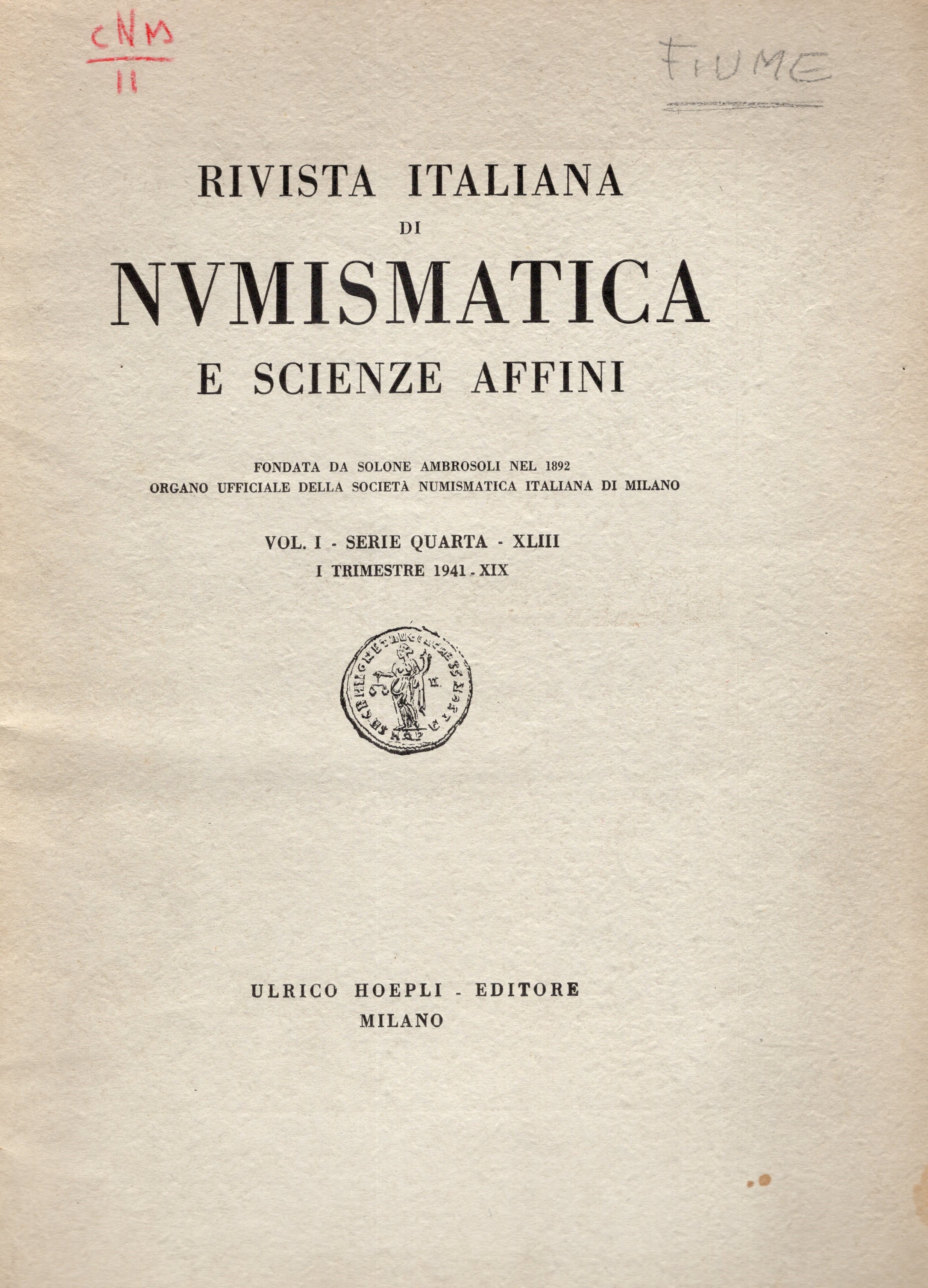 AA.-VV. - Rivista Italiana di Numismatica. I Trimestre 1941. unico pubblicato. Milano, 1941. Indice. Laffranchi L. Le monete legionari dell'Imperatore Gallieno e la sua terza grande vittoria con Tavola.- Smoquina M. La carta moneta civica di Fiume negli anni 1848-1853. con illustrazioni - Pagani A. " I Bersaglieri nelle medaglie" Aggiunte. con illustrazioni. pp. 48, tav. 1 + illutrazioni nel testo. brossura ed. buono stato. raro. importanti lavori. Ruotolo, 267\272.