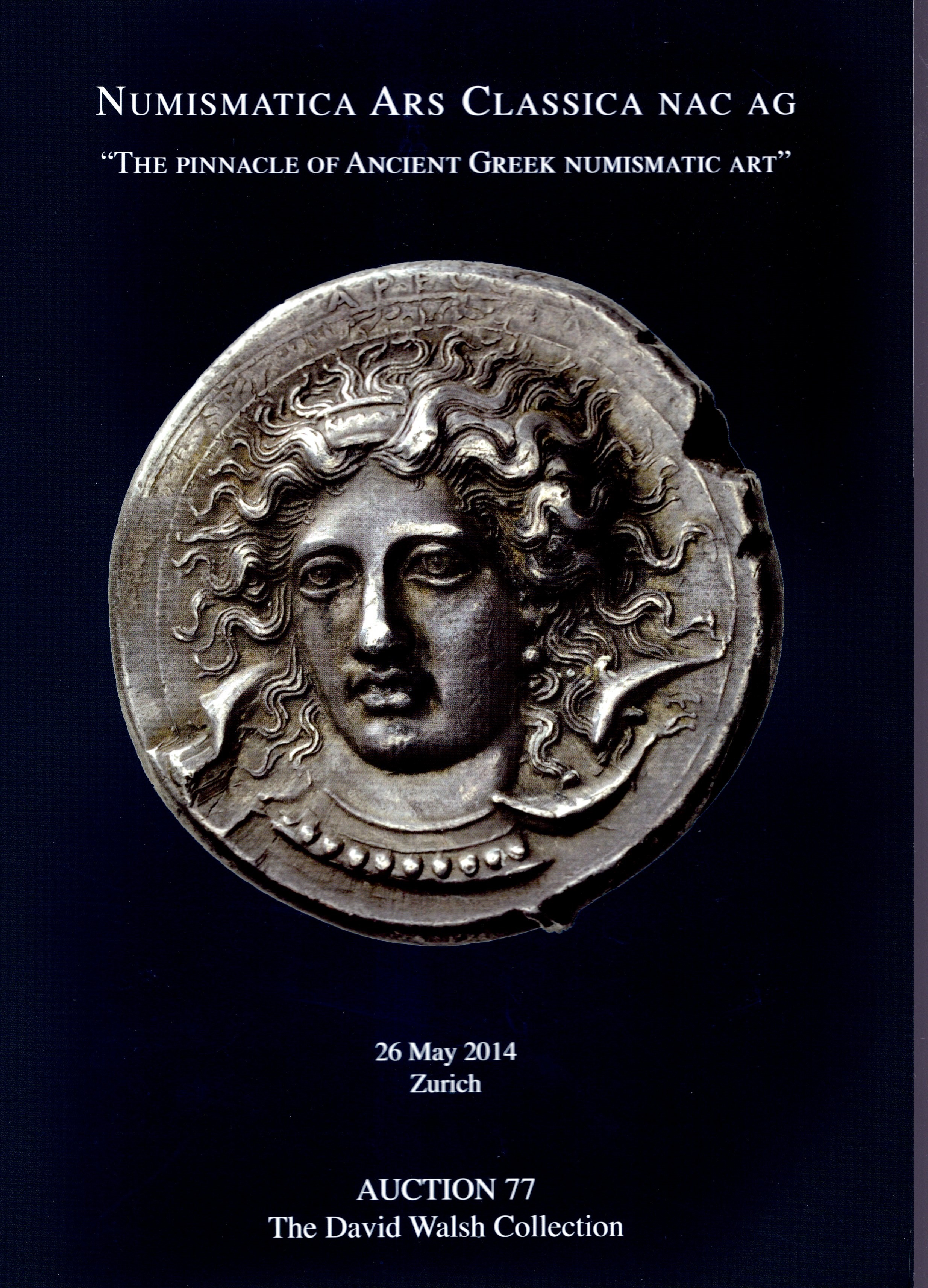 ARS CLASSICA AG - the pinnacle of ancient greek numismatic art. Auction 77, the David Walsh collection. Zurich, 26 - May, 2014. pp 4 con illustrazione a colori del lotto 15. Legatura ed. ottimo stato.