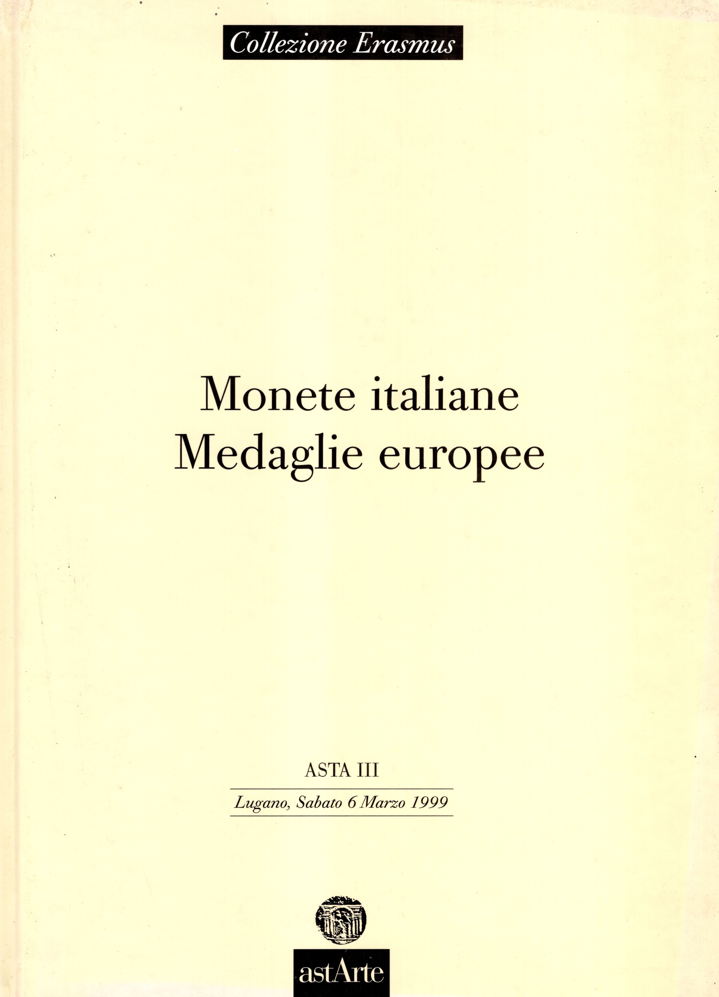ASTARTE. – Lugano, 6 – Marzo, 1999. Collezione Erasmus parte I. Monete italiane, Medaglie europee. Pp. 191, nn. 1001 – 1600, tavv. 8 a colori + ill. nel testo. Legatura ed. Ottimo stato, importante serie veneziana, Gonzaga e medaglistica italiana dal s