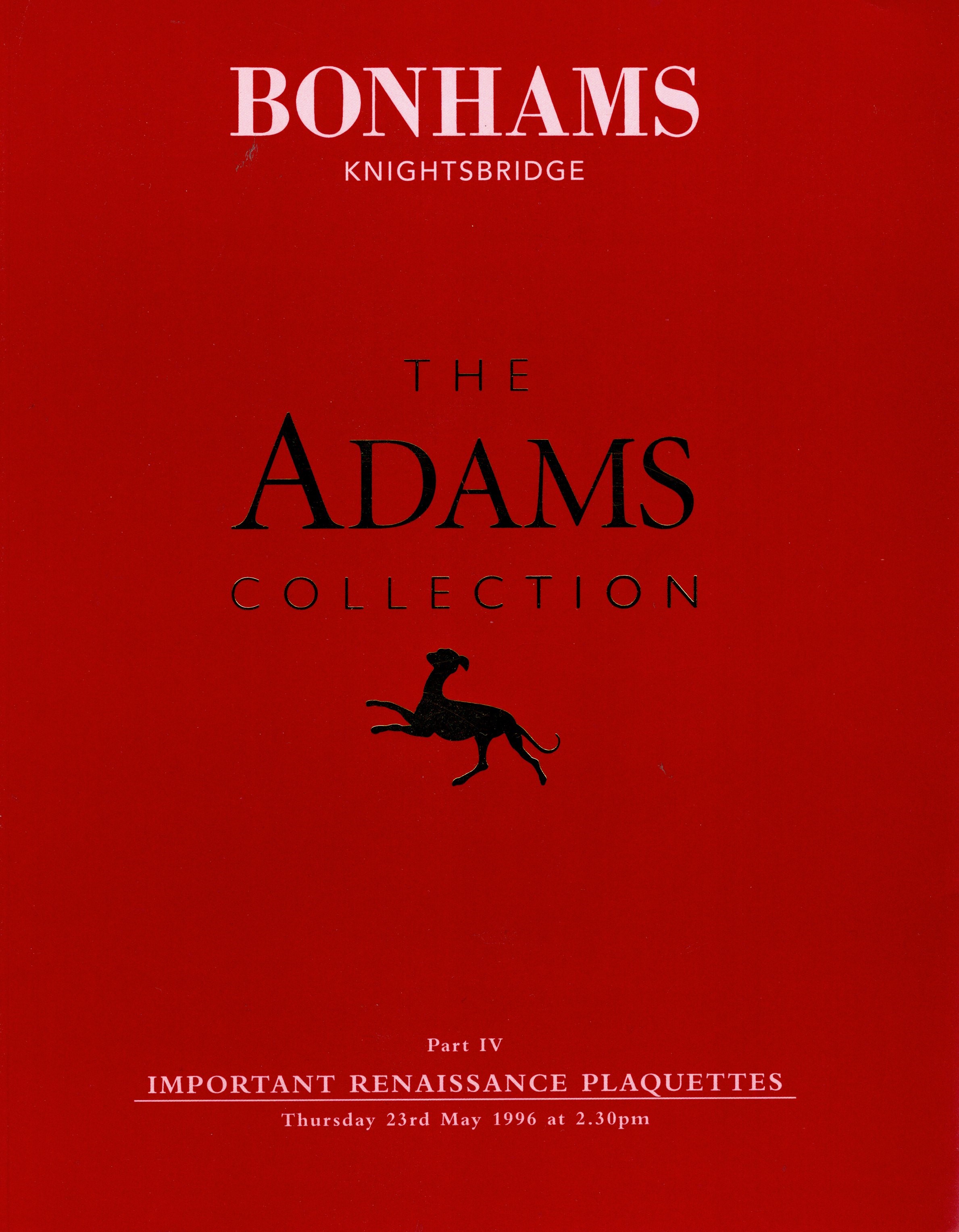 BONHAMS. London, 23 - May, 1996. The Adams collection. Part IV. Important renaissance plaquettes. Pp. 164, nn. 231, tutti illustrati in b\n e colori. rilegatura editoriale, alcune pagine sciolte, interno ottimo stato. importante vendita.