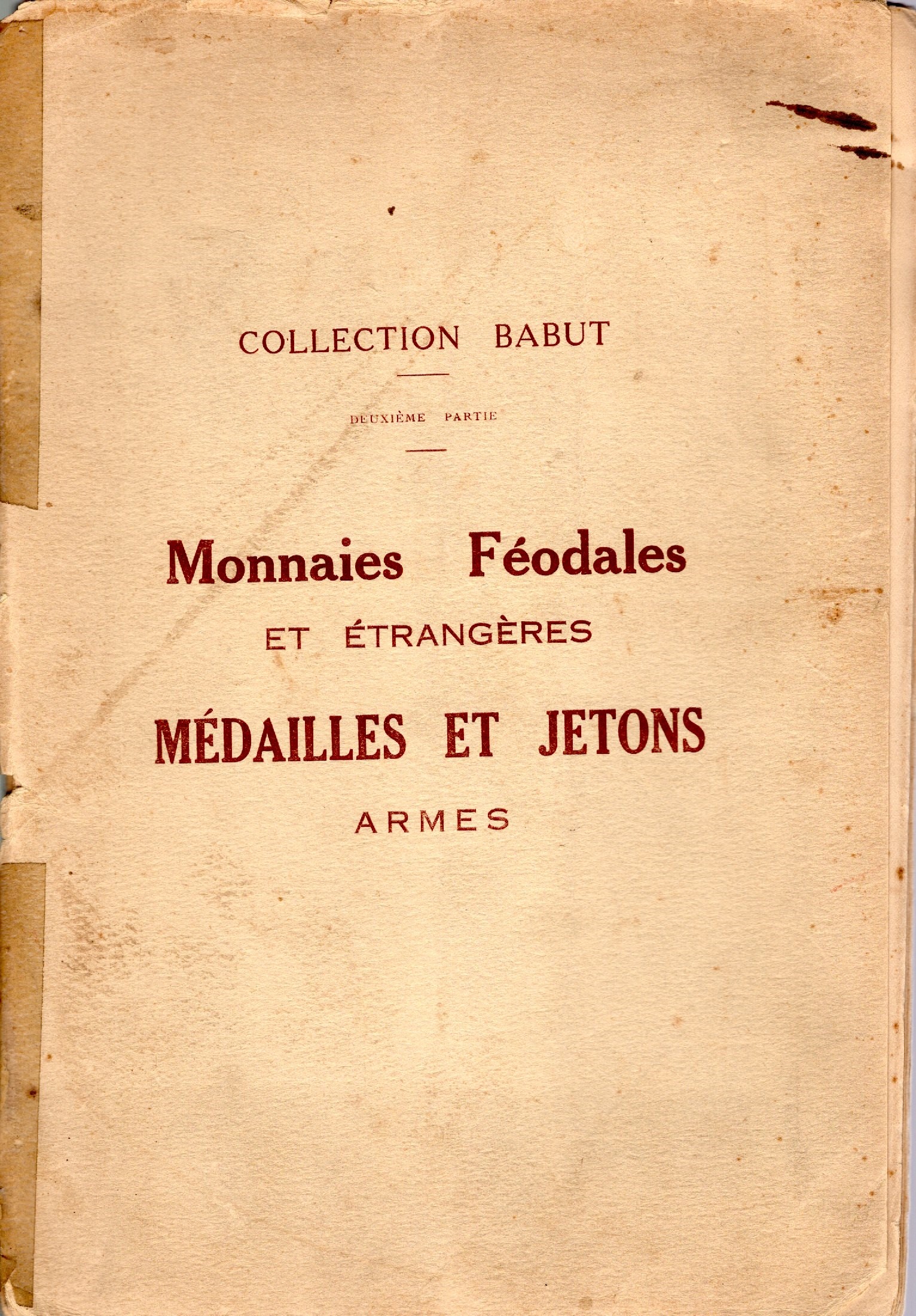 BOURGEY E. - Paris, 5\7 - Decembre, 1927. Collection Babut 2 partie. Monnaies feodales, papales suisse, americanes et diverses medailles & jeton, ecc. ecc. pp. 64, nn. 1210 - 2384, tavv. 6. ril ed sciupata, slegato, buono stato raro. Rossi, 1858