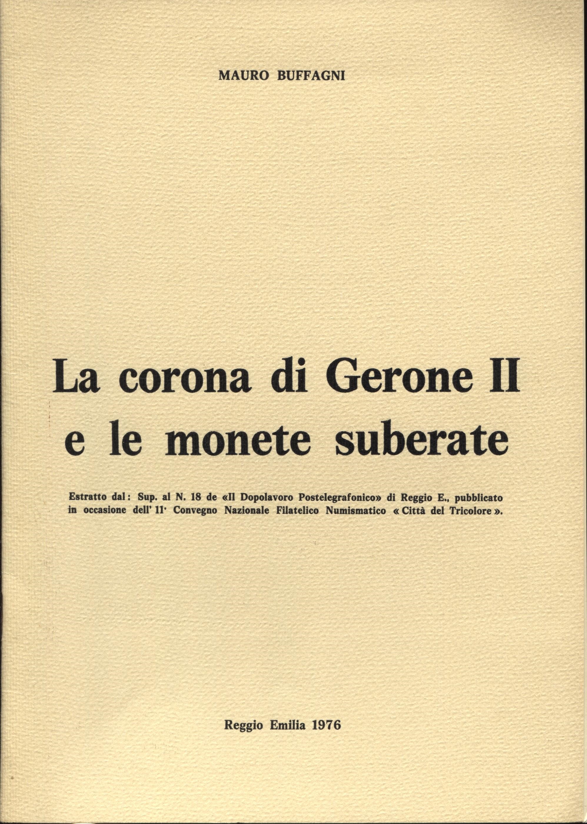 BUFFAGNI M. - La corona di Gerone II e le monete suberate. Reggio Emilia, 1976. Pp. 5 con ill. nel testo. ril. ed. buono stato.