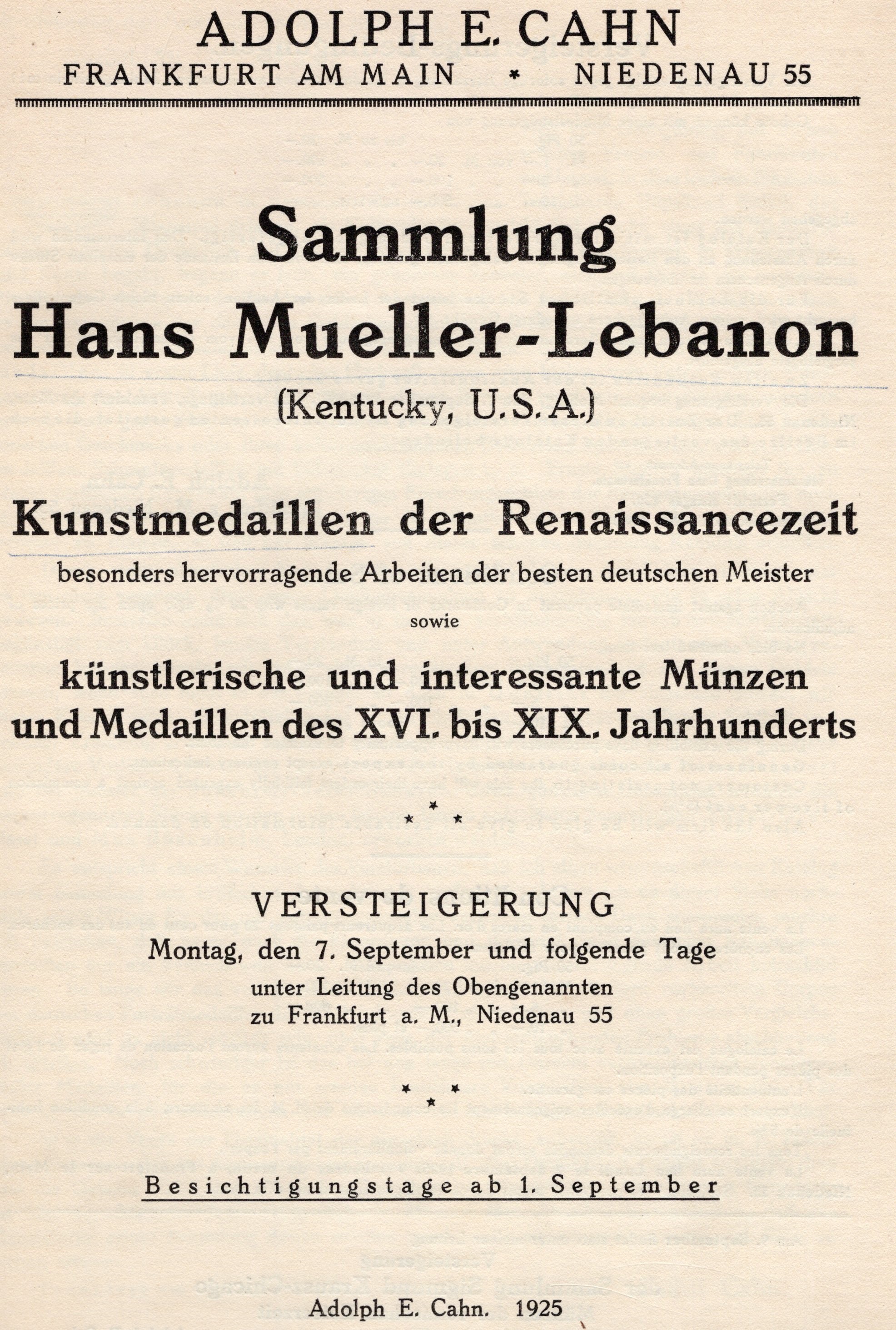 CAHN A.E. - Sammlung Han Mueller - Lebanon. Kunstmedaillen der Renaissancezeit. Frankfurt am Main, 7 - September - pp. 70, nn. 336, tavv. 30. ril. \ tela con scritte,interno ottimo stato, importante Rossi, 512