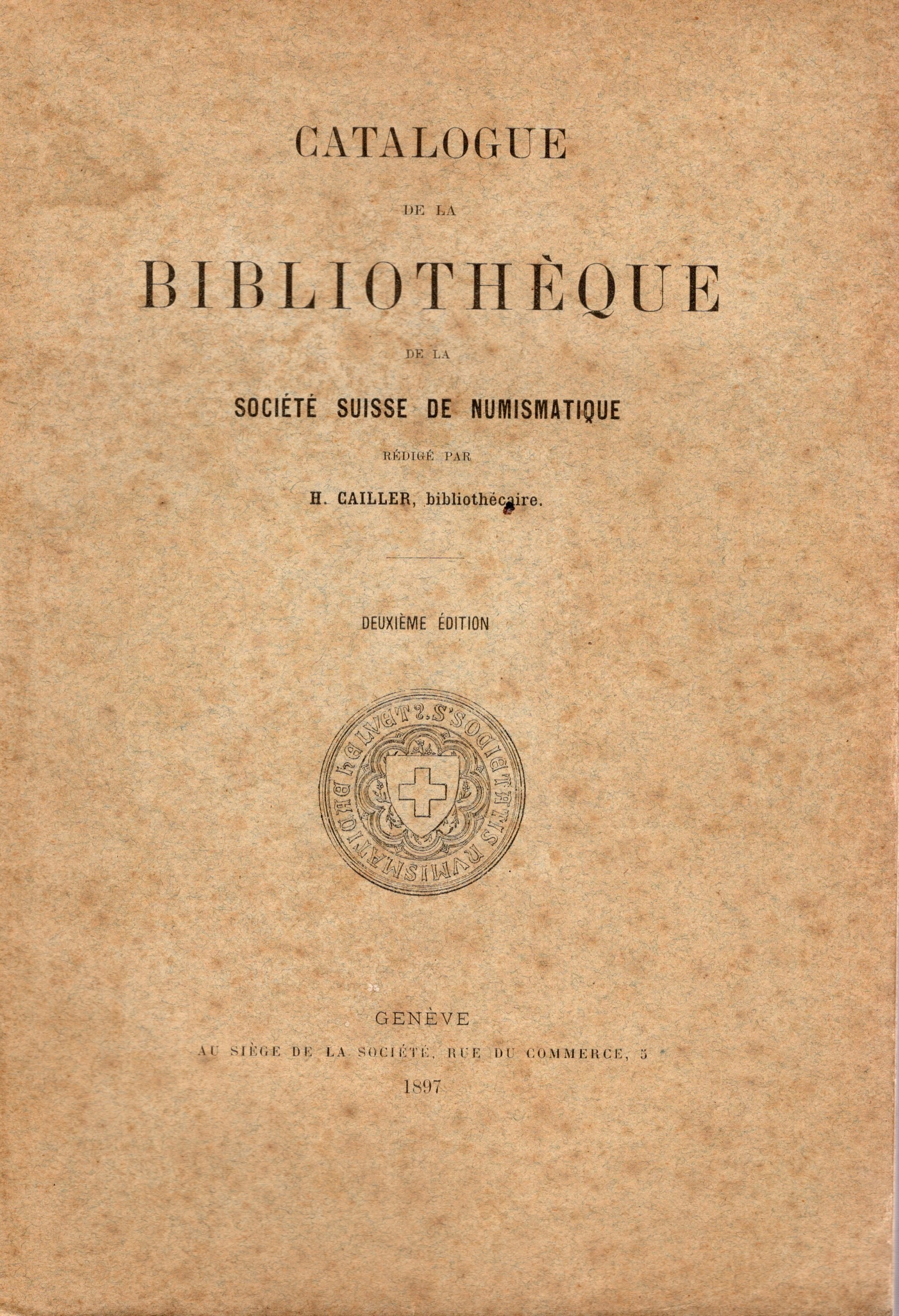 CAILLER H. - Catalogue de la Bibliotheque de la Societe Suisse de Numismatique. Geneve, 1897. Deuxieme edition. Pp. 168. brossura ed. sciupata, interno buono stato, molto raro e importante.ex libris C.S. 8