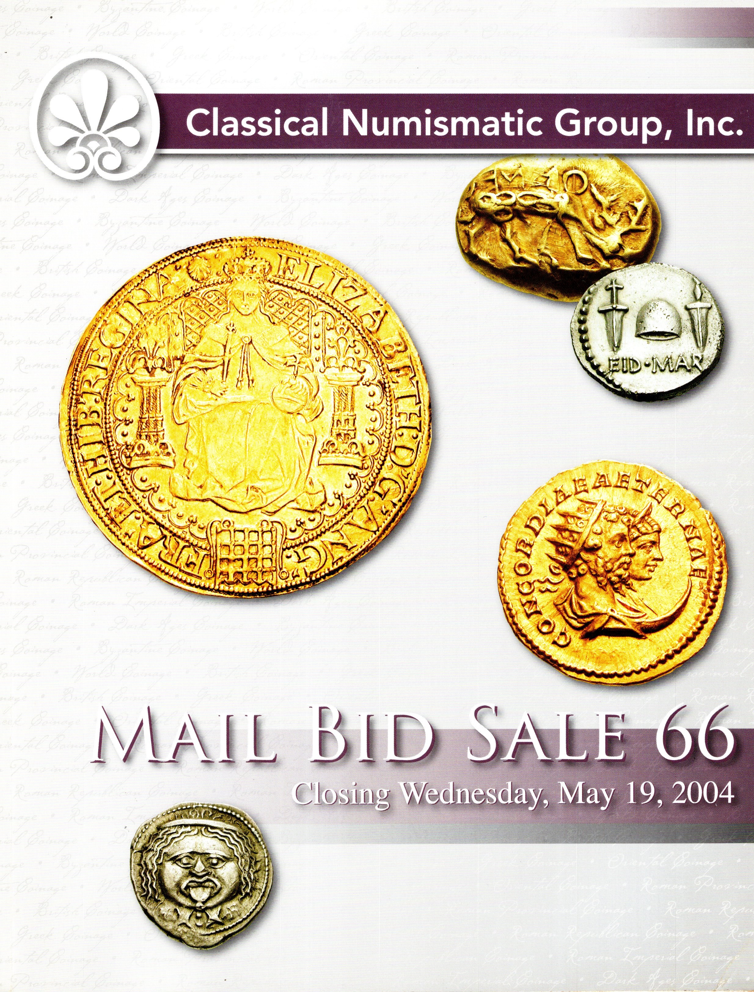 CLASSICAL NUMISMATIC GROUP - Auction 66. Mail bid sale, closing 19 - May, 2004. Greek, Roman and Byzantine coins, World coins. Pp 167, lots 1855, tutti illustrati nel testo + 4 tavole a colori. Legatura ed. ottimo stato.