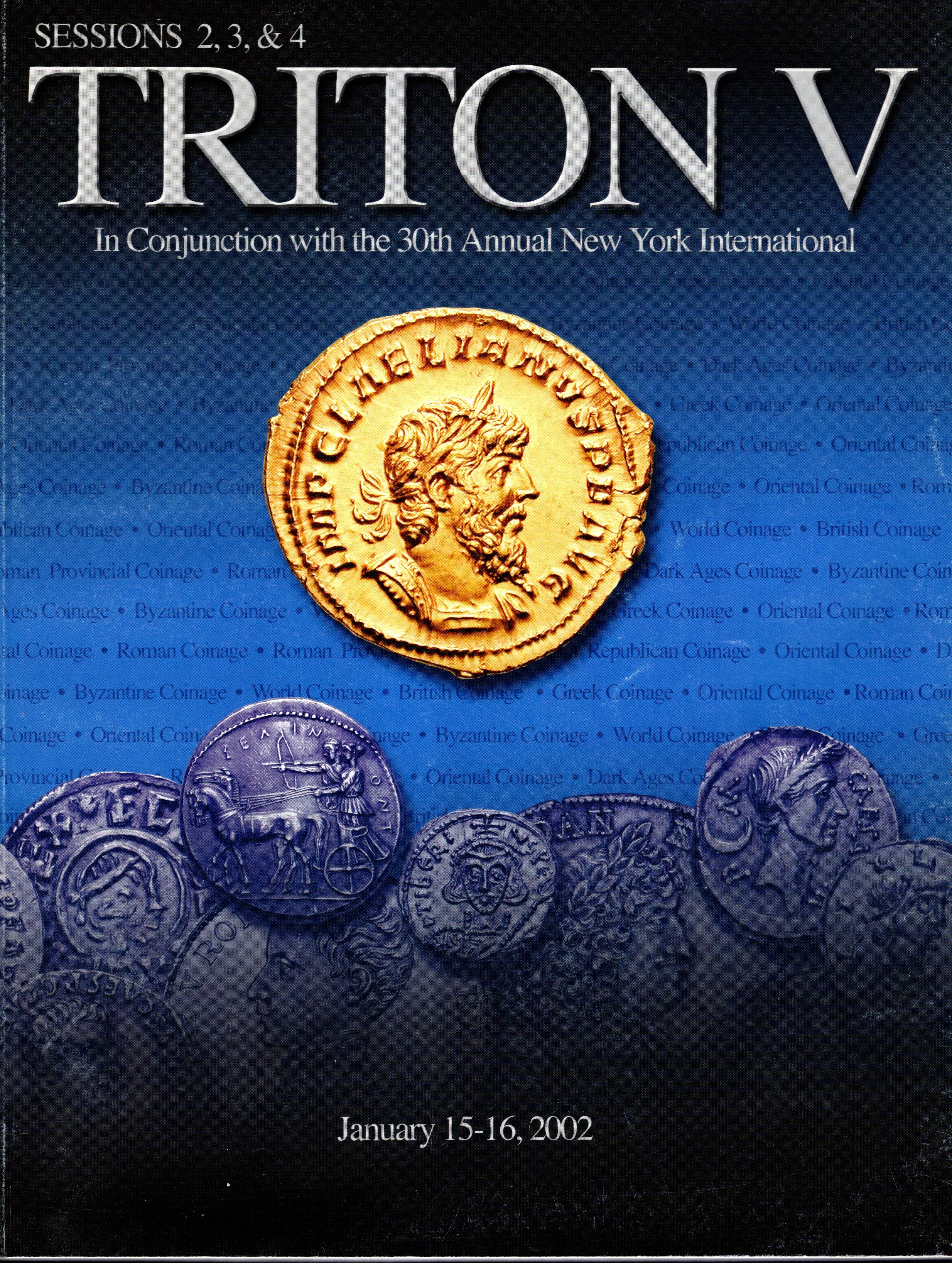 CNG. Triton V session 2.3.&4. – New York, 15\16 – January, 2002. Greek and Roman coins, Aes Grave, Byzantine….. Pp 288, lots 2573, plates 20+ illustrazioni nel testo con ingrandimenti. Legatura ed. lista prezzi Aggiudicazione, buono stato.