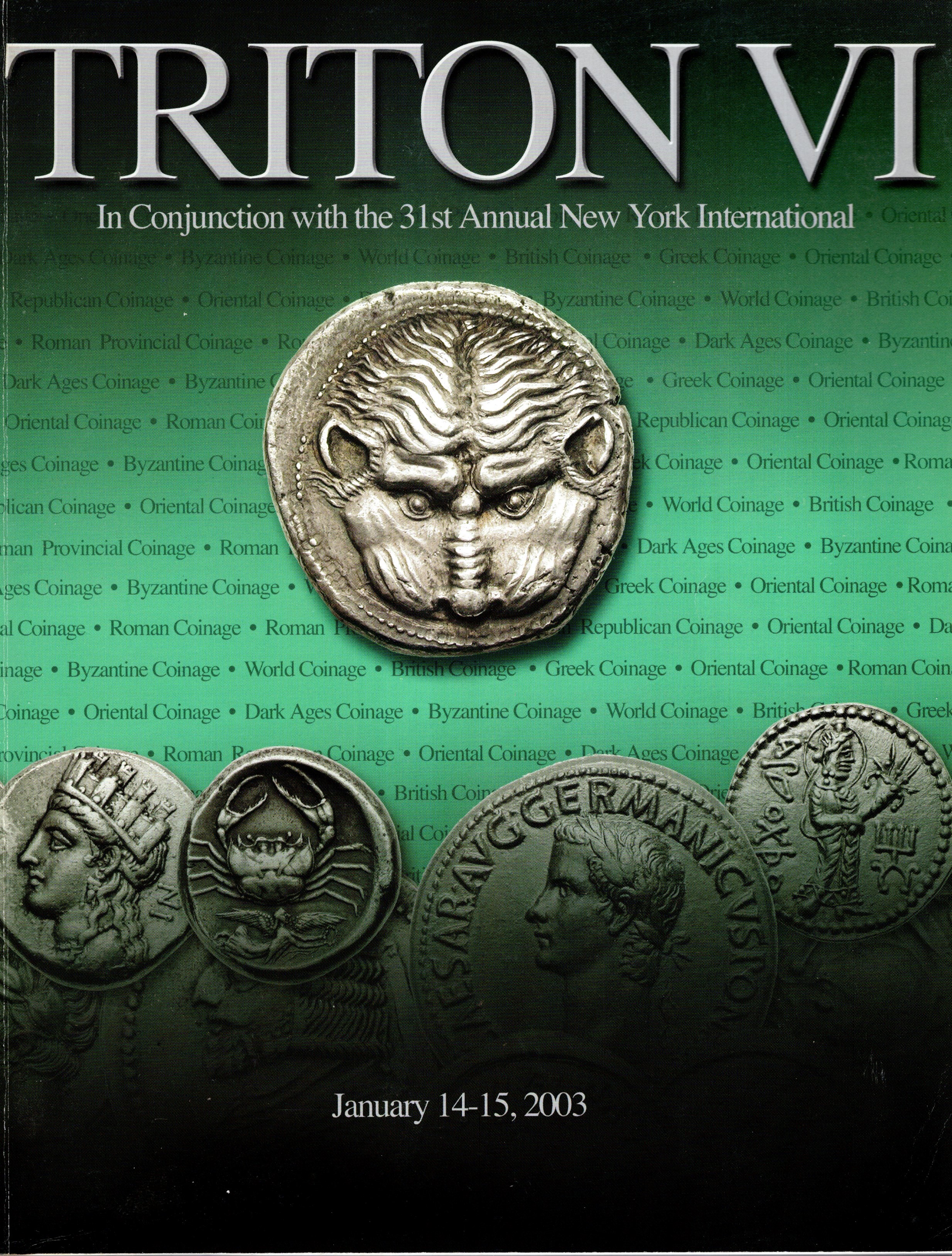 CNG. Triton VI. – New York, 14\15 – January, 2003. Greek and Roman coins……pp 312, lots 1771, plates 23 a colori + illustrazioni con ingrandimenti nel testo. Legatura ed. buono stato.