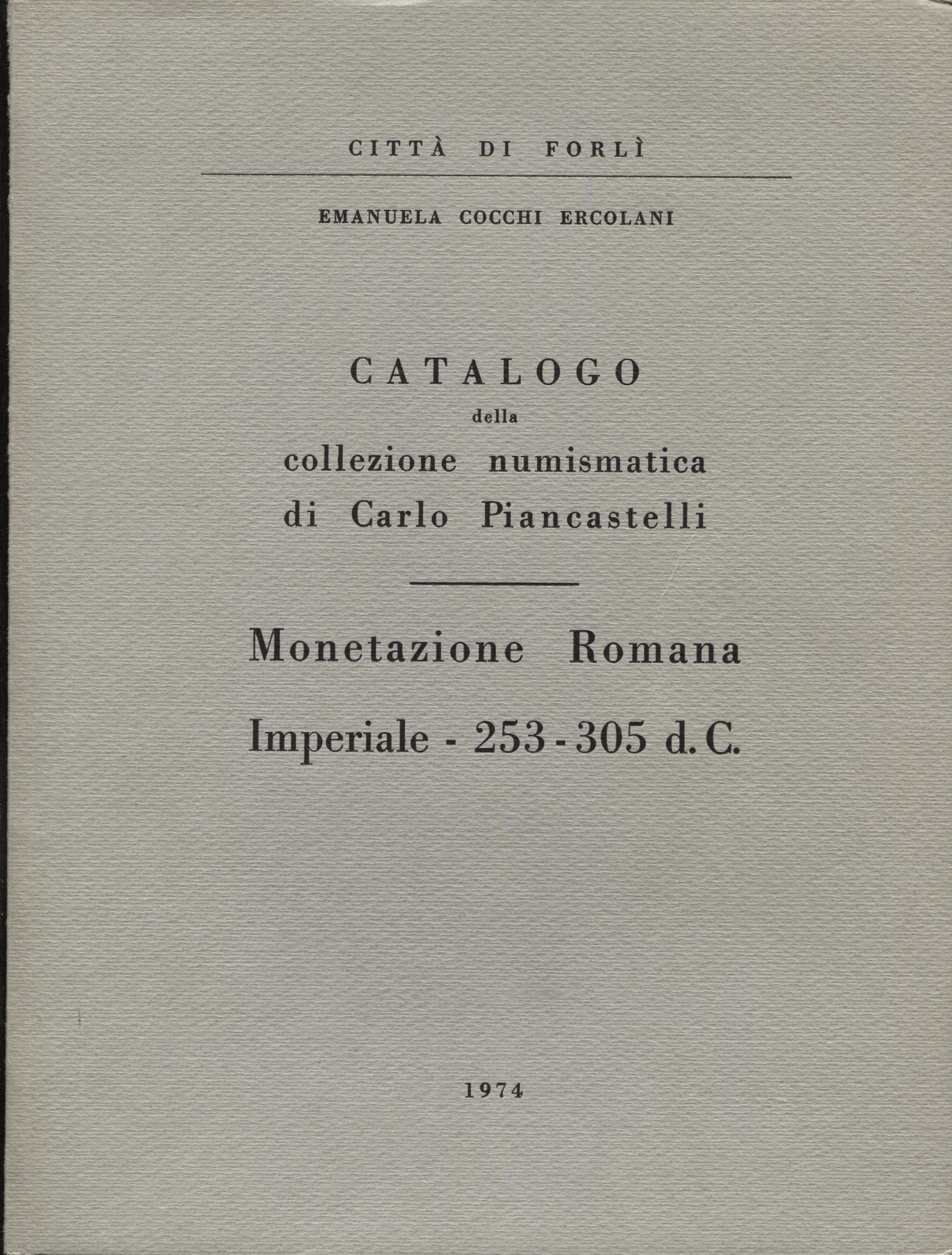 COCCHI ERCOLANI - Catalogo della collezione numismatica di Carlo Piancastelli. Monetazione romana imperiale ( 253 - 305 d. C.).Forlì, 1974. pp. 154 +14, tavv. 45. ril. editoriale, buono stato,raro.