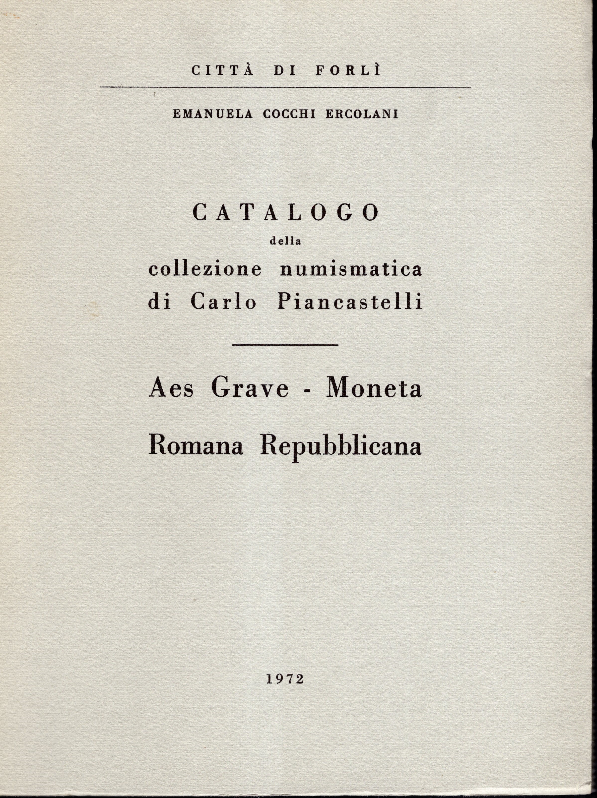 COCCHI ERCOLANI E. - Catalogo della collezione numismatica di Carlo Piancastelli. Aes Grave -Moneta romana repubblicana. Forli, 1972. pp. 62, tavv. 20. ril editoriale, ottimo stato.