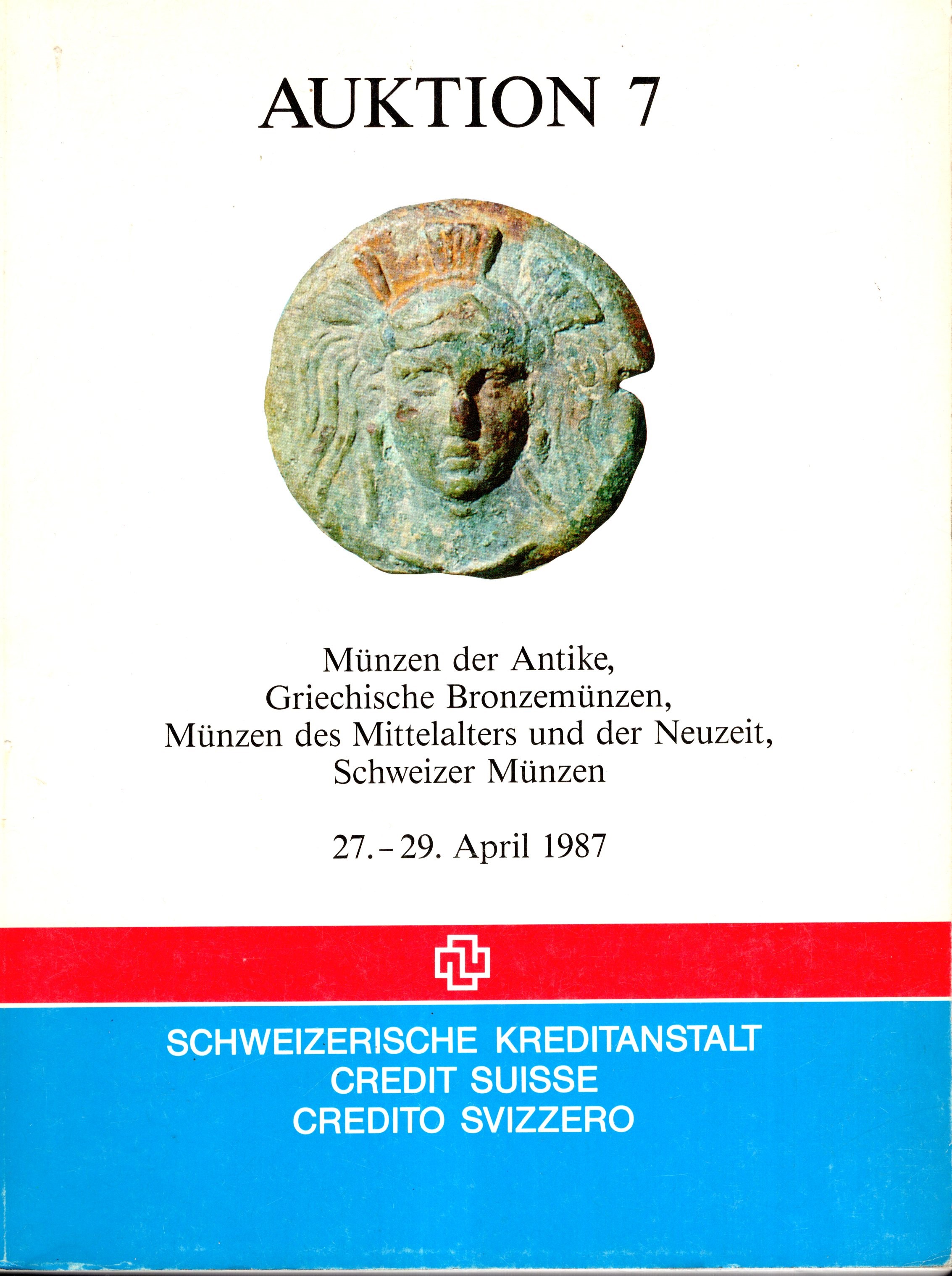 CREDIT SUISSE. Auktion 7. Bern, 27\29 - April, 1987. Munzen der antike, Griechische Bronzemunzen, mittelalters, Schweizer munzen. Pp 344, lots, 2278, plates, 4 colour + illustrations in text. binding ed. very good condition. important sale of Greek bronze