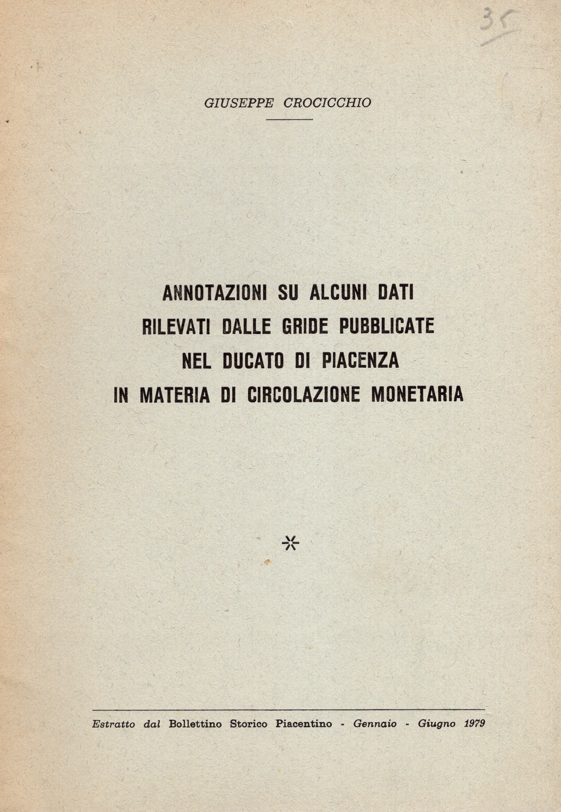 CROCICCHIO Giuseppe. – Annotazioni su alcuni dati rilevati dalle grida pubblicate nel Ducato di Piacenza in materia di circolazione monetaria. Piacenza, 1979. Pp. 28 – 59. brossura editoriale, esemplare n 69\100 importante, ottimo stato, importante lavoro