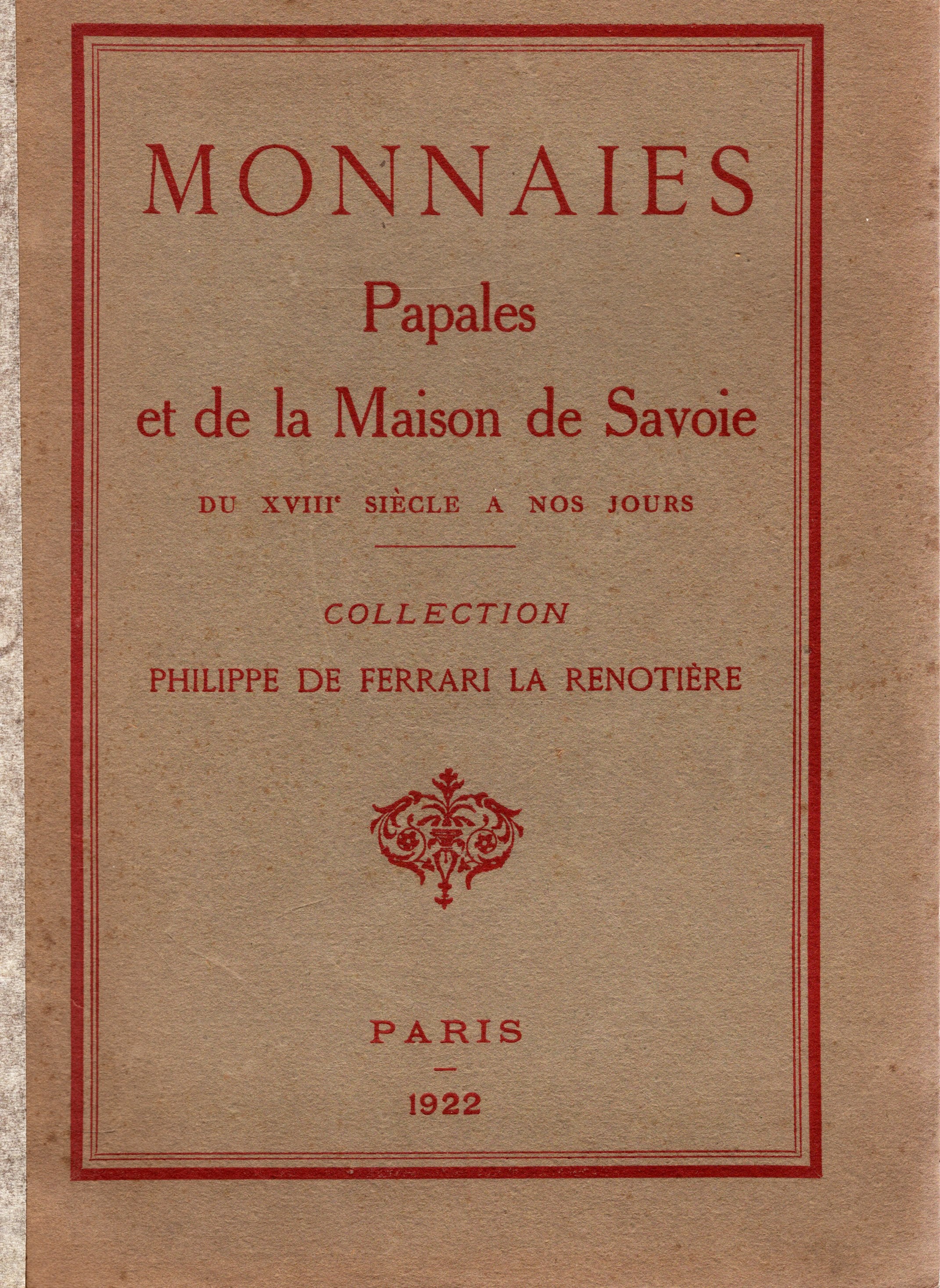 FLORANGE J. M. – CIANI LOUIS – Paris, 18/20 - 12-1922. Monnaies papales et de la Savoie du XVIII siecle a nos jours provenant des collection de feu Philippe de Ferrari La Renotiere. pp. 55, nn. 1012, tavv. 13.ril ed sciupata interno ottimo stato, raro e importante Rossi, 1962.