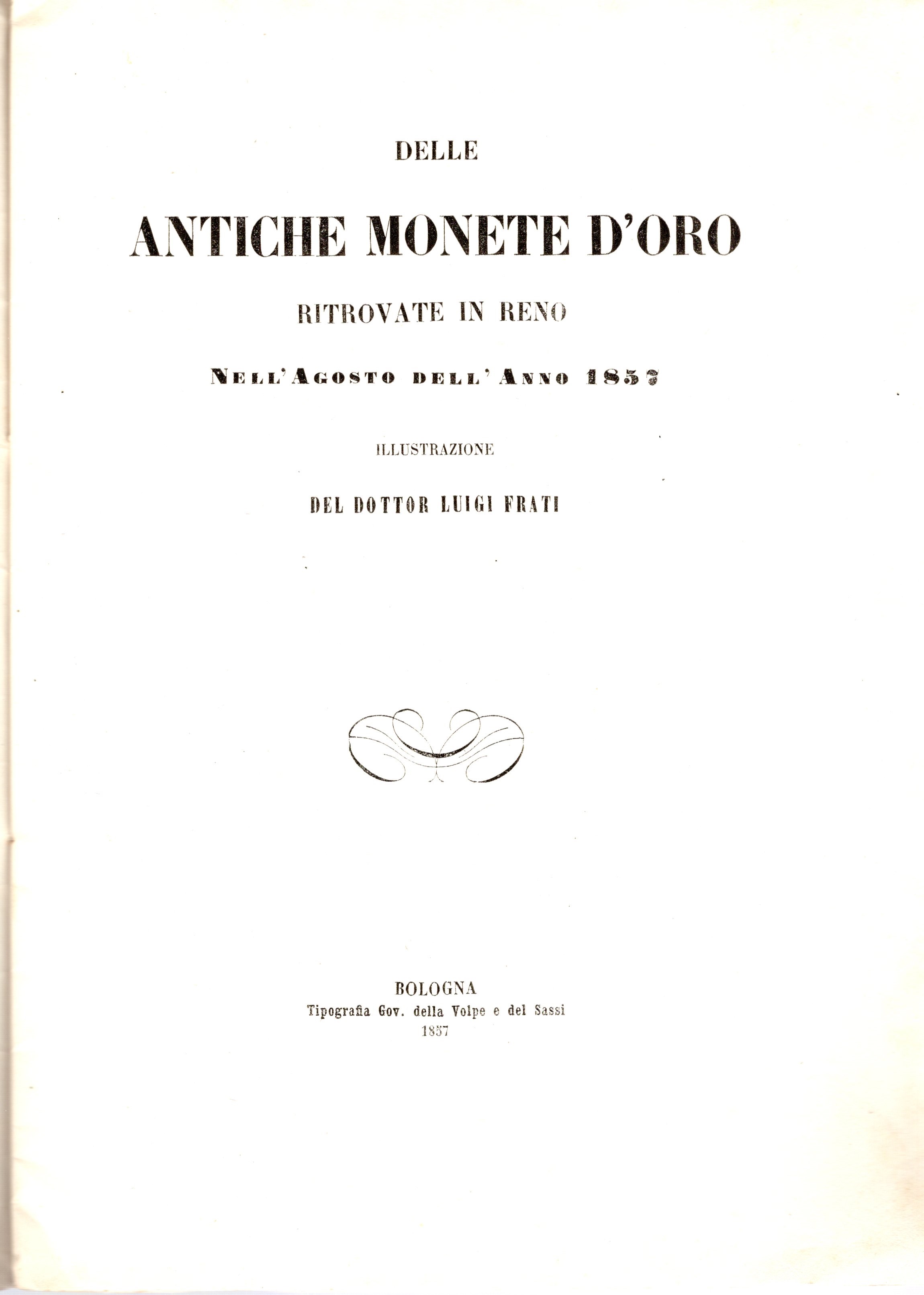 FRATI L. - Delle antiche monete d'oro ritrovate in Reno nell'Agosto dell'anno 1857. Bologna, 1857. pp 19, tav. 1 + 1 tavola sinottica. Brossura muta, interno ottimo stato. Monete bizantine, arabe e beneventane. ex libris.
