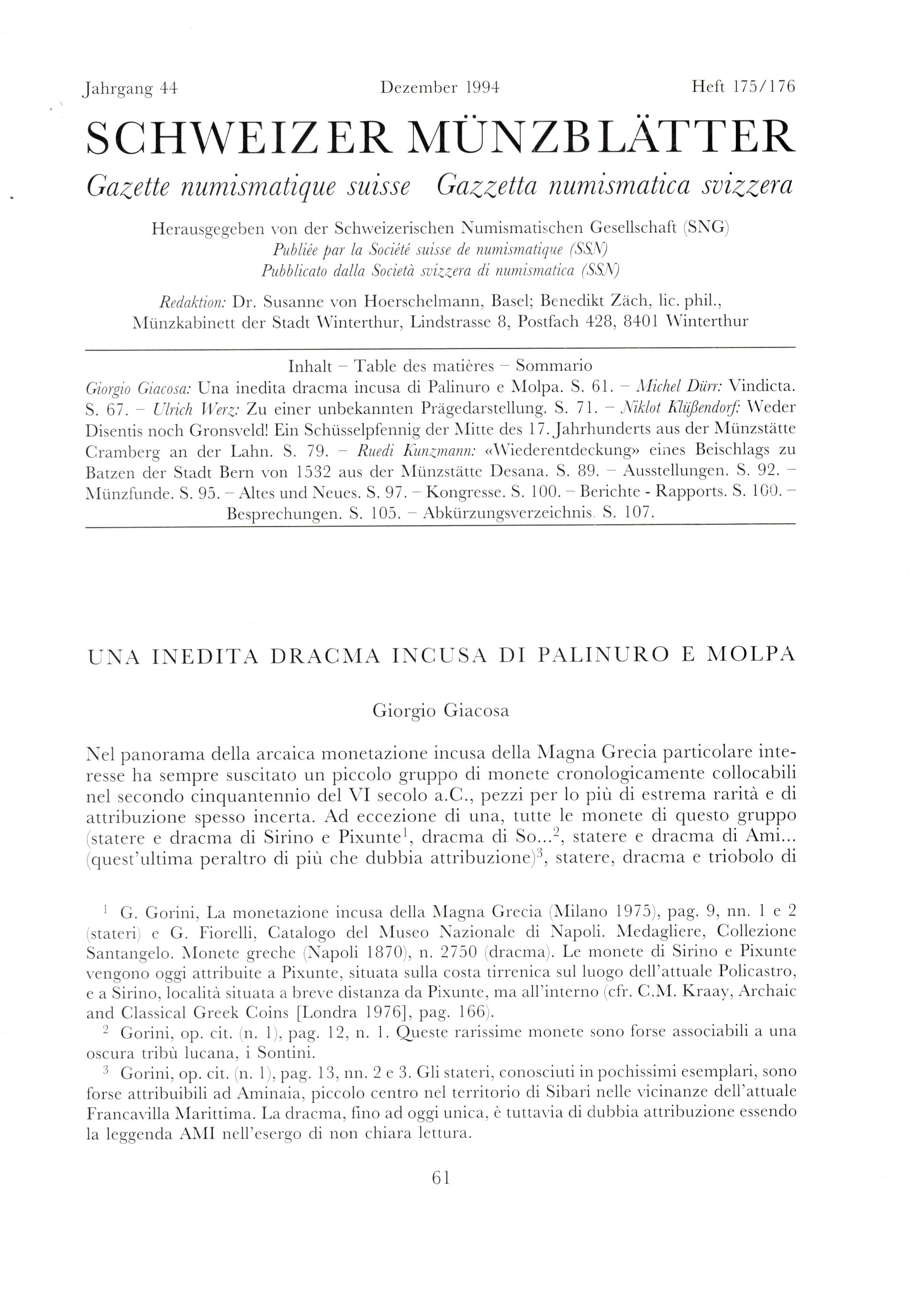 GIACOSA Giorgio. - Una inedita dracma incusa di Palinuro e Molpa. Basel, 1994. pp 61 - 66, illustrazini nel testo. brossura editoriale, buono stato, imortante contributo alla numismatica incusa magno greca