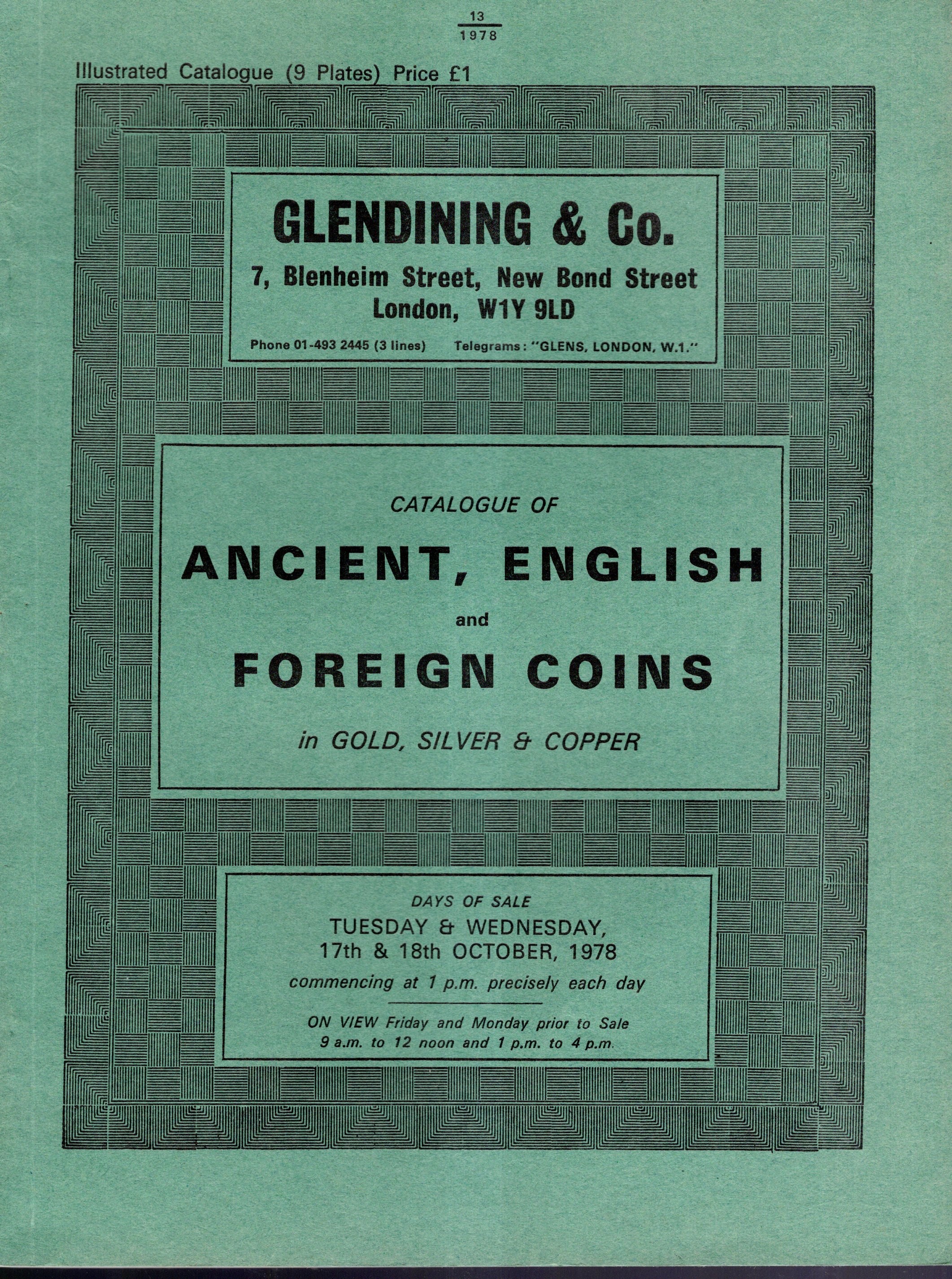 GLENDINING & CO. London, 17\18- October, 1978. Catalogue of ancient,english and foreign coins. Pp 56, lots 635, plates 9.Brossura ed. lista prezzi Aggiudicazione, buono stato. Manville-Robertson, 43