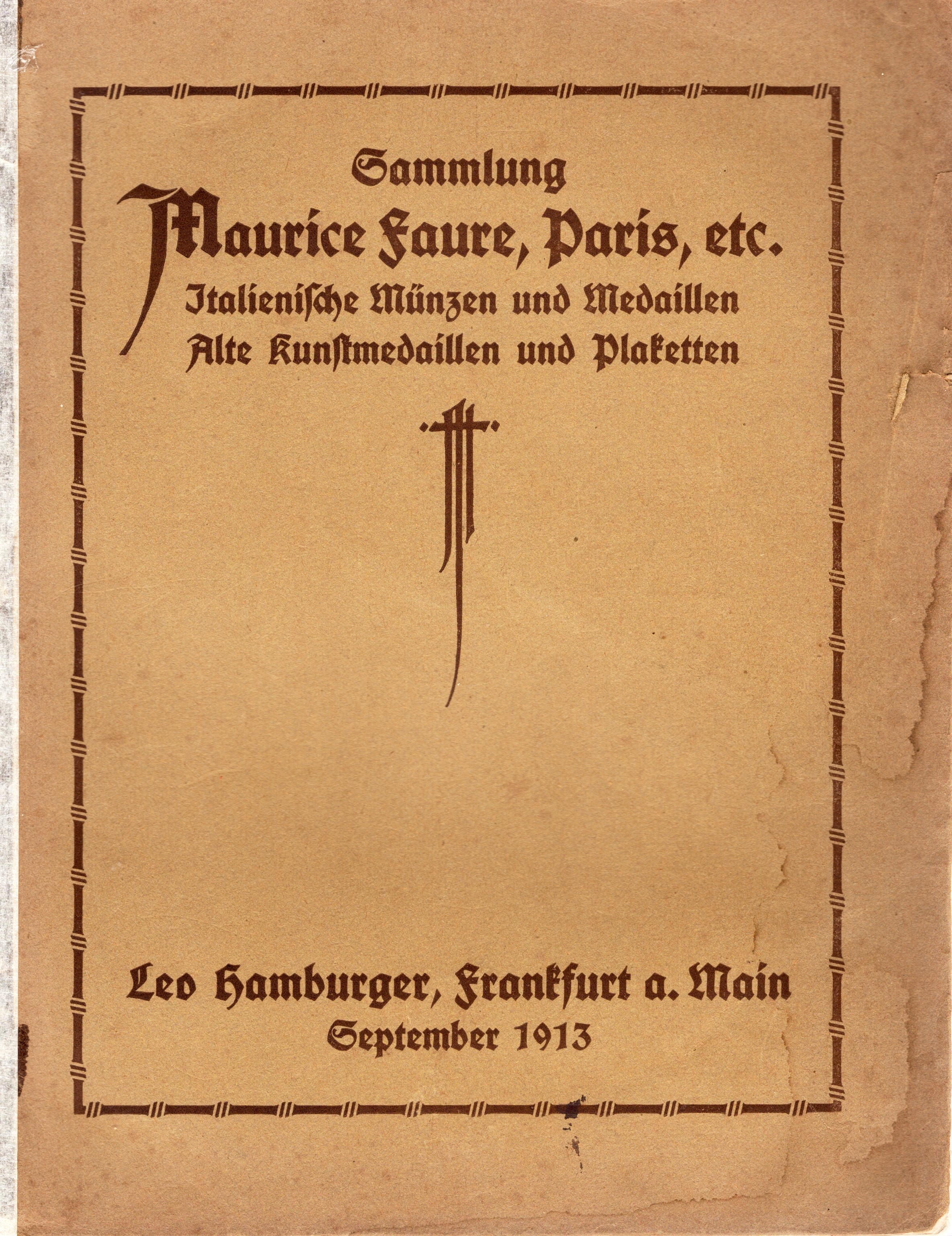 HAMBURGER LEO – Frankfurt a.M. 22/23-9-1913. Katalog sammlung des herrn Maurice Faure , Paris. Florentiner und sonstige italienische munzen und medaillen. Alte Kunstmedaillen und Plaketten. pp.61, nn. 733, tavv. 26. ril.ril ed sciupata, interno buono stato, molto importante e raro. Importante collezione di monete italiane,sopratutto di Firenze, medaglie e placchette italiane del XV – XVIII secolo. Rossi, 752