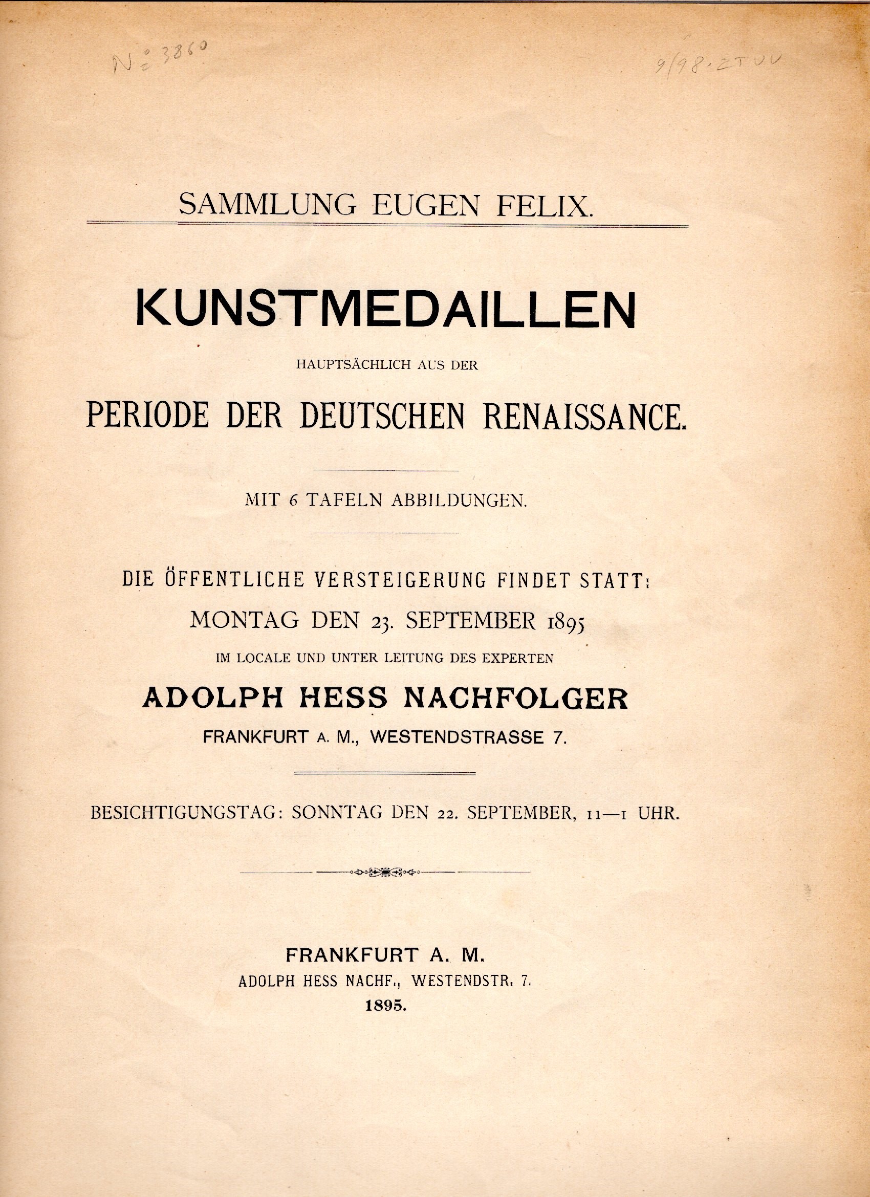HESS AD. NACHFOLGER. - Frankfurt am Main, 23 - September, 1895. Sammlung Eugen Felix. Kunstmedaillen hauptsachich aus der periode der deutschen renaissance. Pp.iv -47, nn. 301, tavv. 6. ril tutta similpelle con scritte sul dorso, interno buono stato, molto raro e ricercato. Rossi, 993.