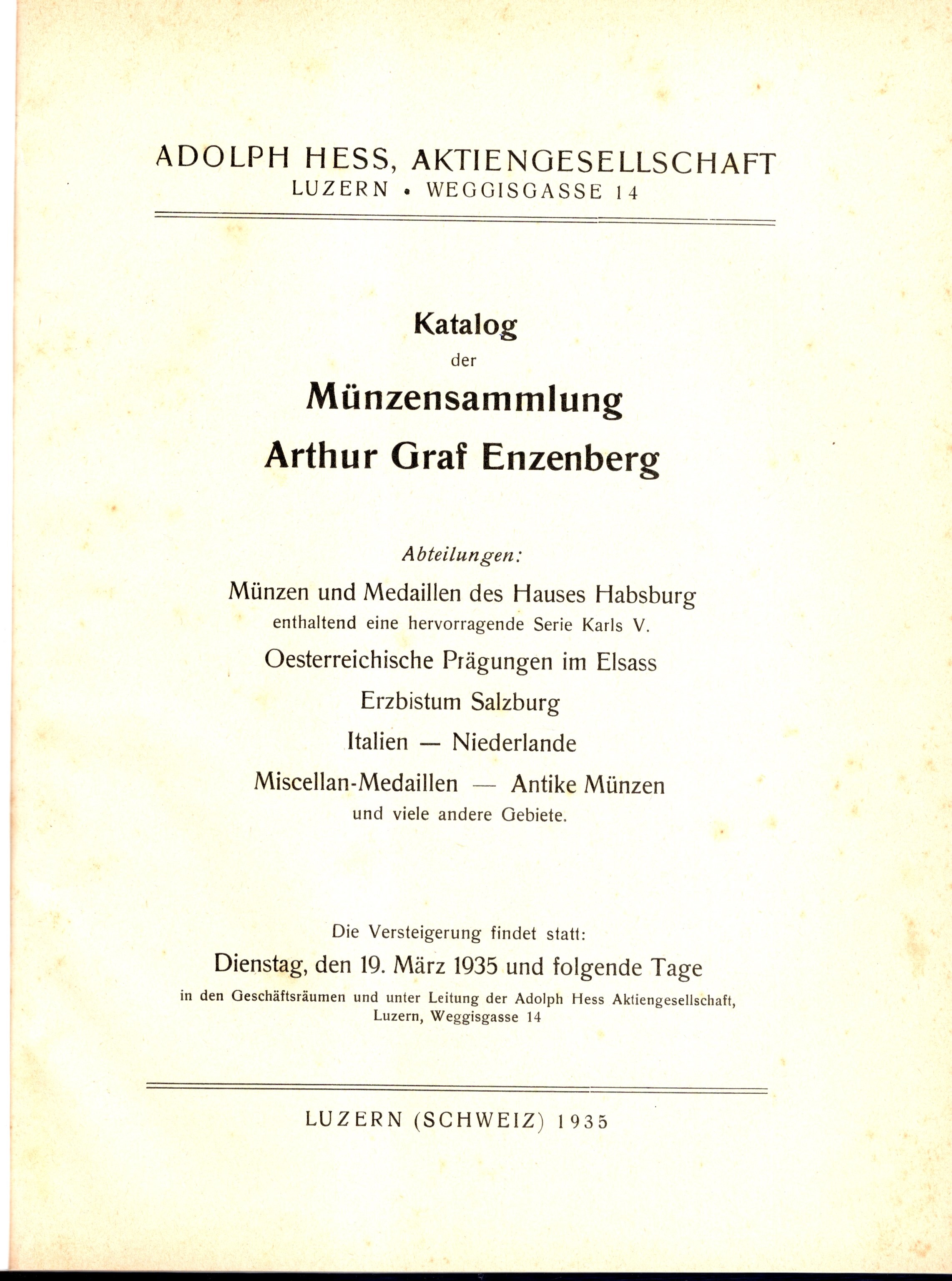 HESS Adolph - Luzern, 19 - Marz, 1935. Munzsammlung Arthur Graf Enzenberg. Munzen und medaillen des hauses Hasburg serie Karl V, Italien, Salzburg, Niederlande, Elsass, antike munzen.. Pp 38, lots 1330, plates 14. Legatura rigida, interno ottimo stato, raro e ricercato. Rossi, 277.