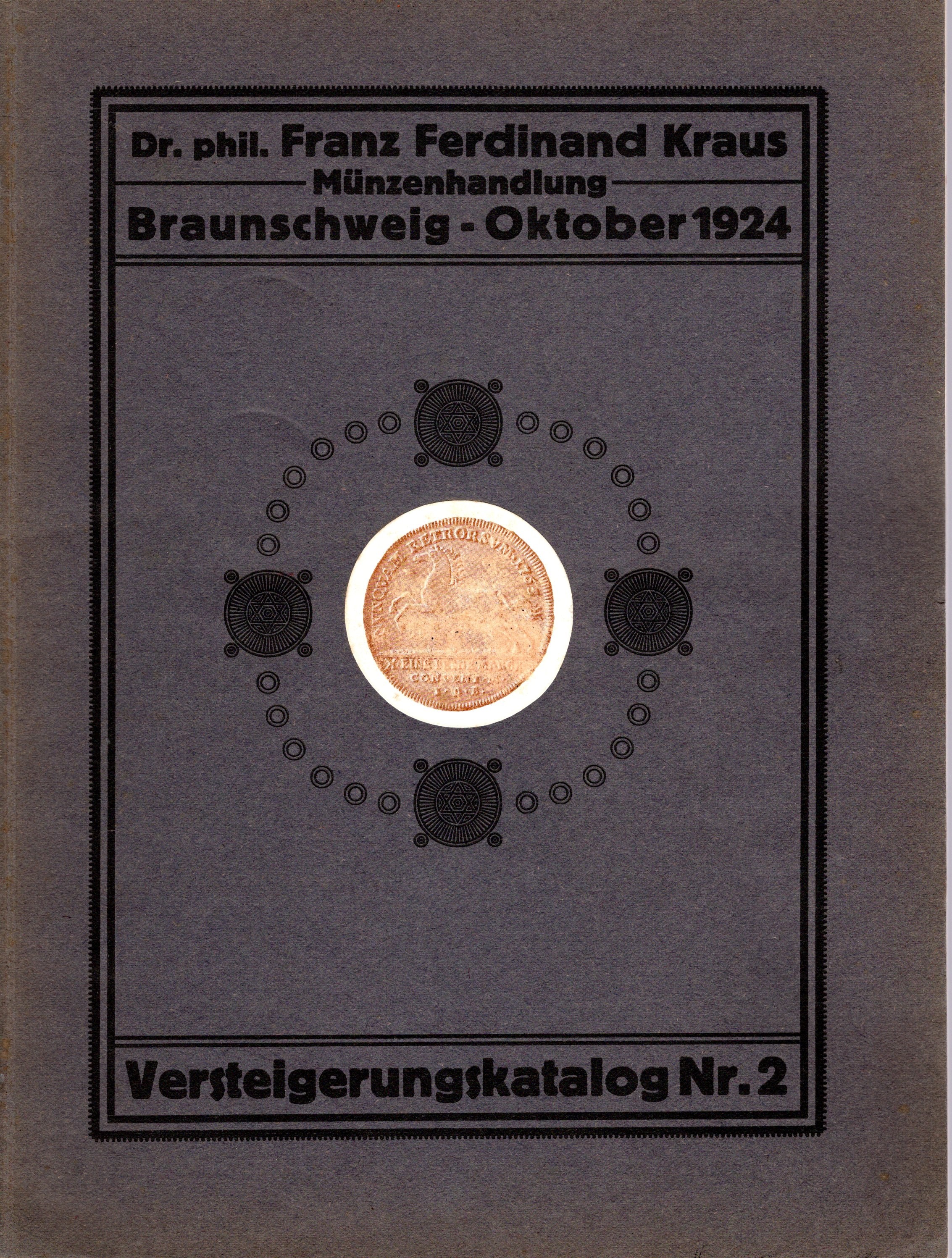 KRAUS F. F. - Katalog 2. Braunschweig, 21 - Oktober, 1924. Munzen und medaillen der Stadte und Herrschaften Niedersachesns sowie des Kronigreichs Westfalen. Pp. 71, lots 674, plates 10. rilegatura editoriale, ottimo stato, raro. Rossi 1230.