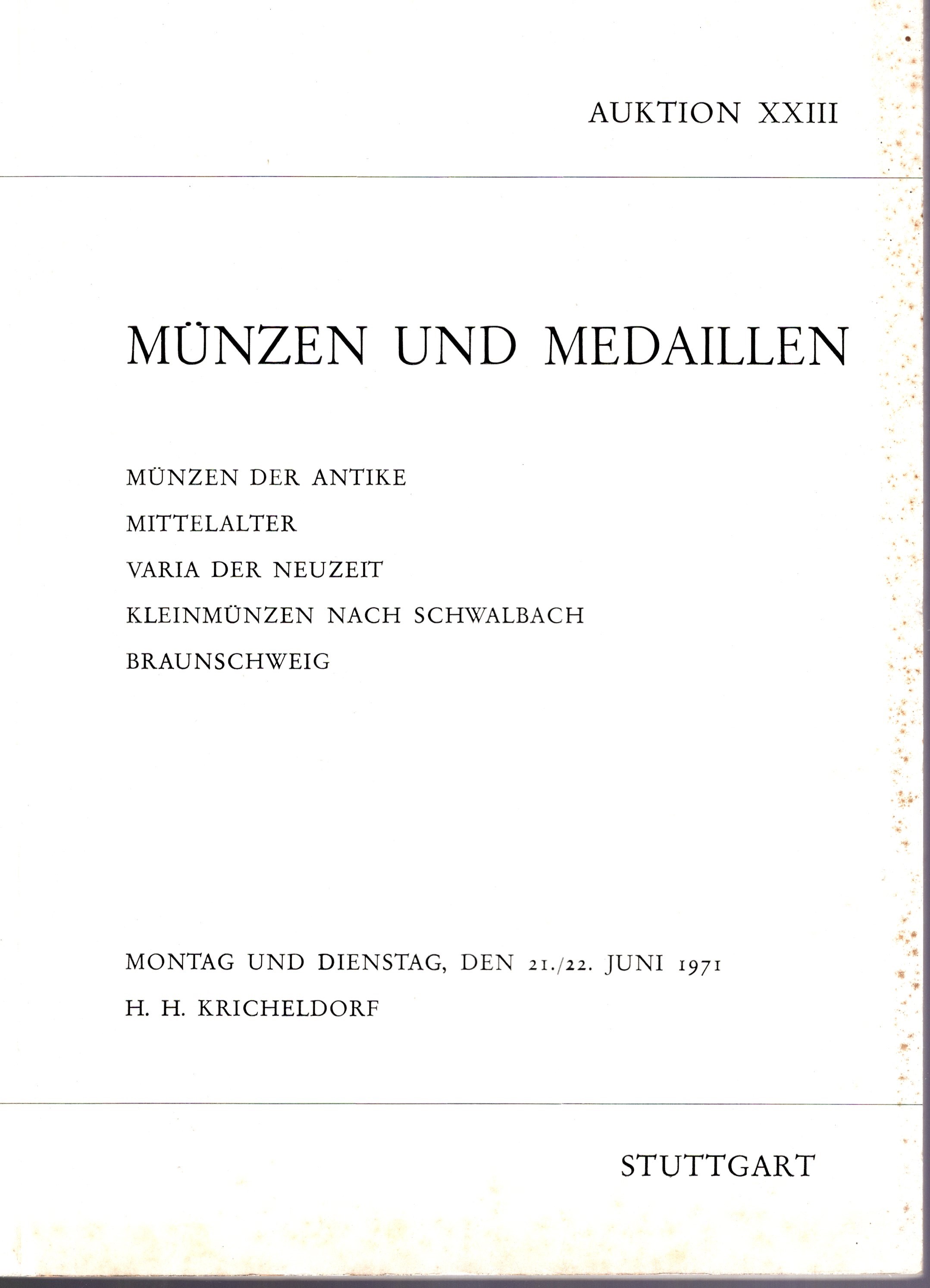 KRICHELDORF H.H. - Auktion XXIII. Stuttgart, 21\22 - Juni, 1971. Munzen der antike, mittealter, kleinmunzen nach Schwalbach, Braunschweig.. Pp 81, lots 1379, plates 54, Legatura ed. sciupata, interno ottimo stato.