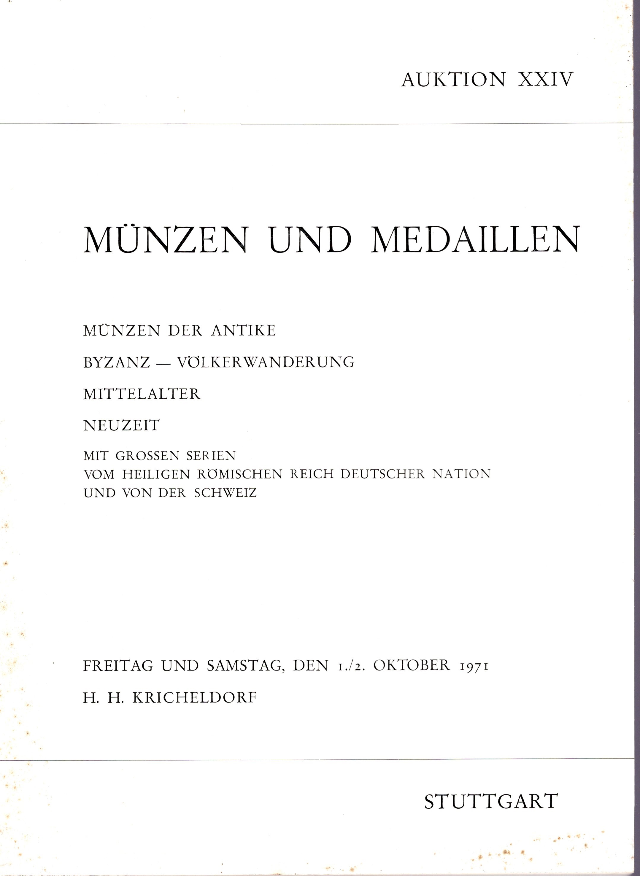 KRICHELDORF H.H. - Auktion XXIV. Stuttgart, 1\2 - Oktober, 1971. Munzen der antike, Byzanz, Volkerwanderung, mittelalter…… pp 68, lots 932, plates 54. Legatura ed, buono stato.
