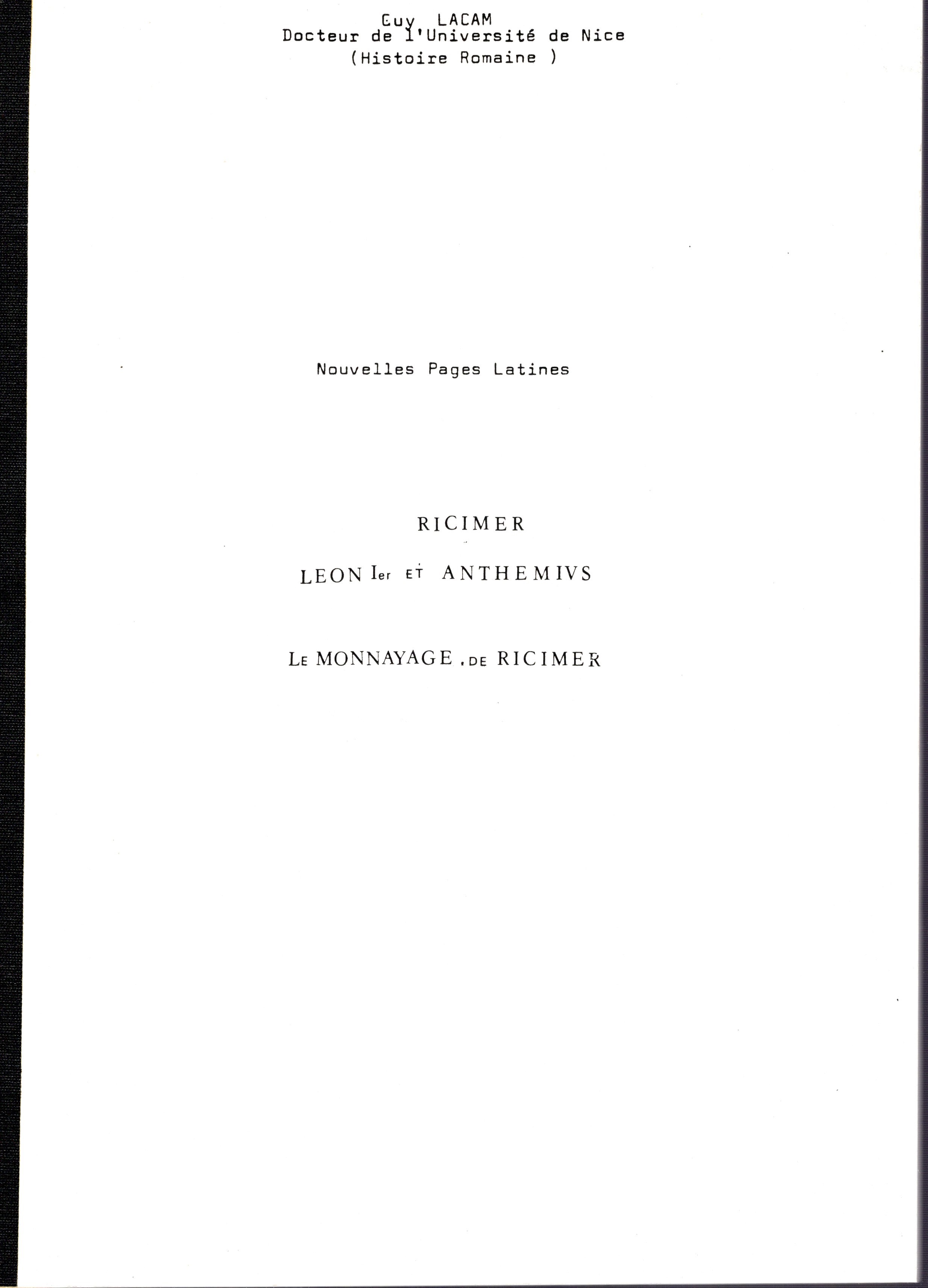 LACAM GUY. - Ricimer, Leon et Anthemivs. Le monnayage de Ricimer. Paris, 1986. pp 48, tavv. 8. rilegatura d'ufficio, bella fotocopia al laser, di un lavoro estremamente raro da trovarsi sul mercato antiquario.
