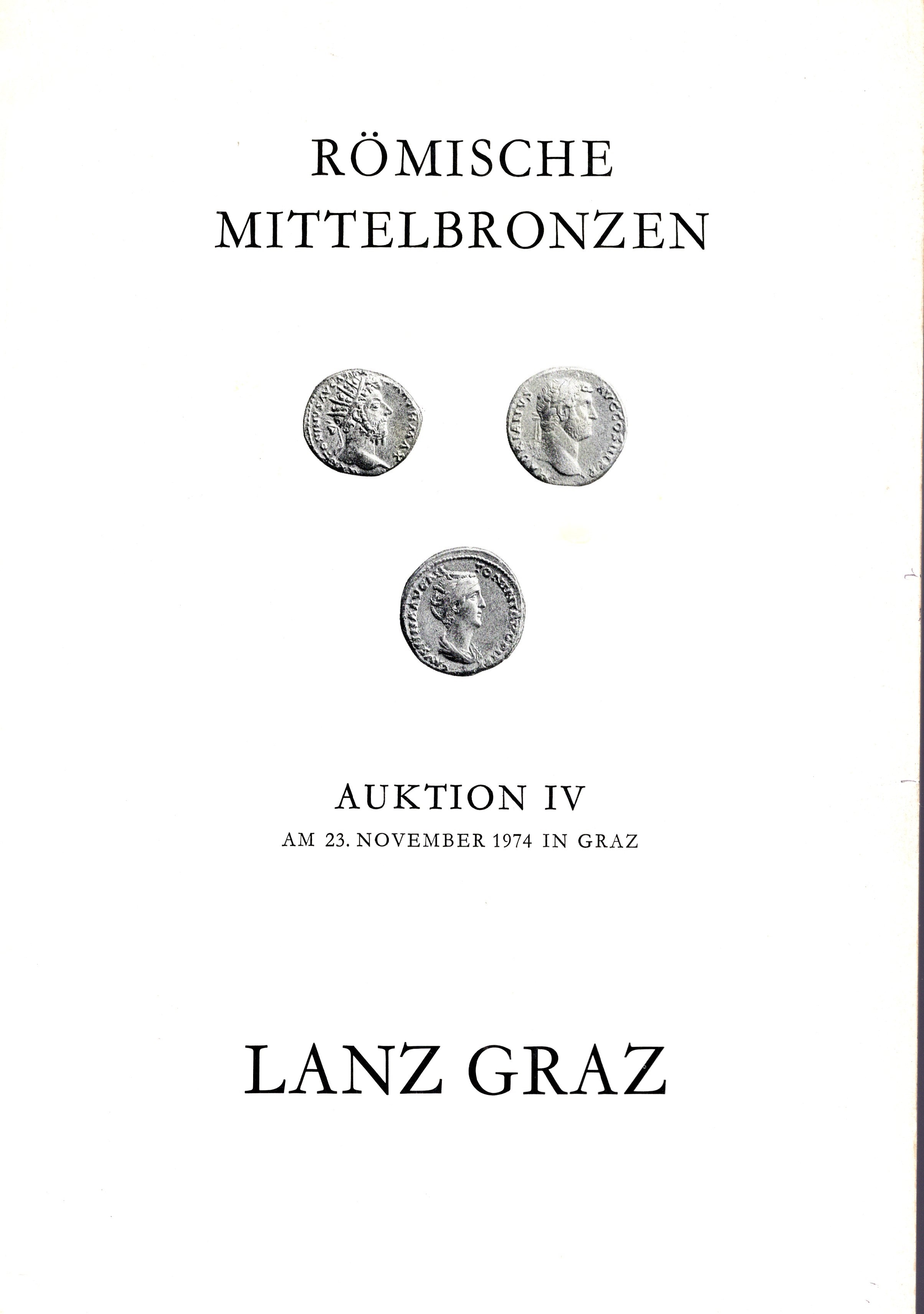 LANZ Graz - Auktion IV. Graz, 23 - November, 1974. Romische mittelbronzen.Republik Kaiserreich. Augustus - Carinus. Pp 39, lots 780, plates 30. brossura ed. lista prezzi Valutazione, interno ottimo stato, importante e rara vendita. Spring, 403