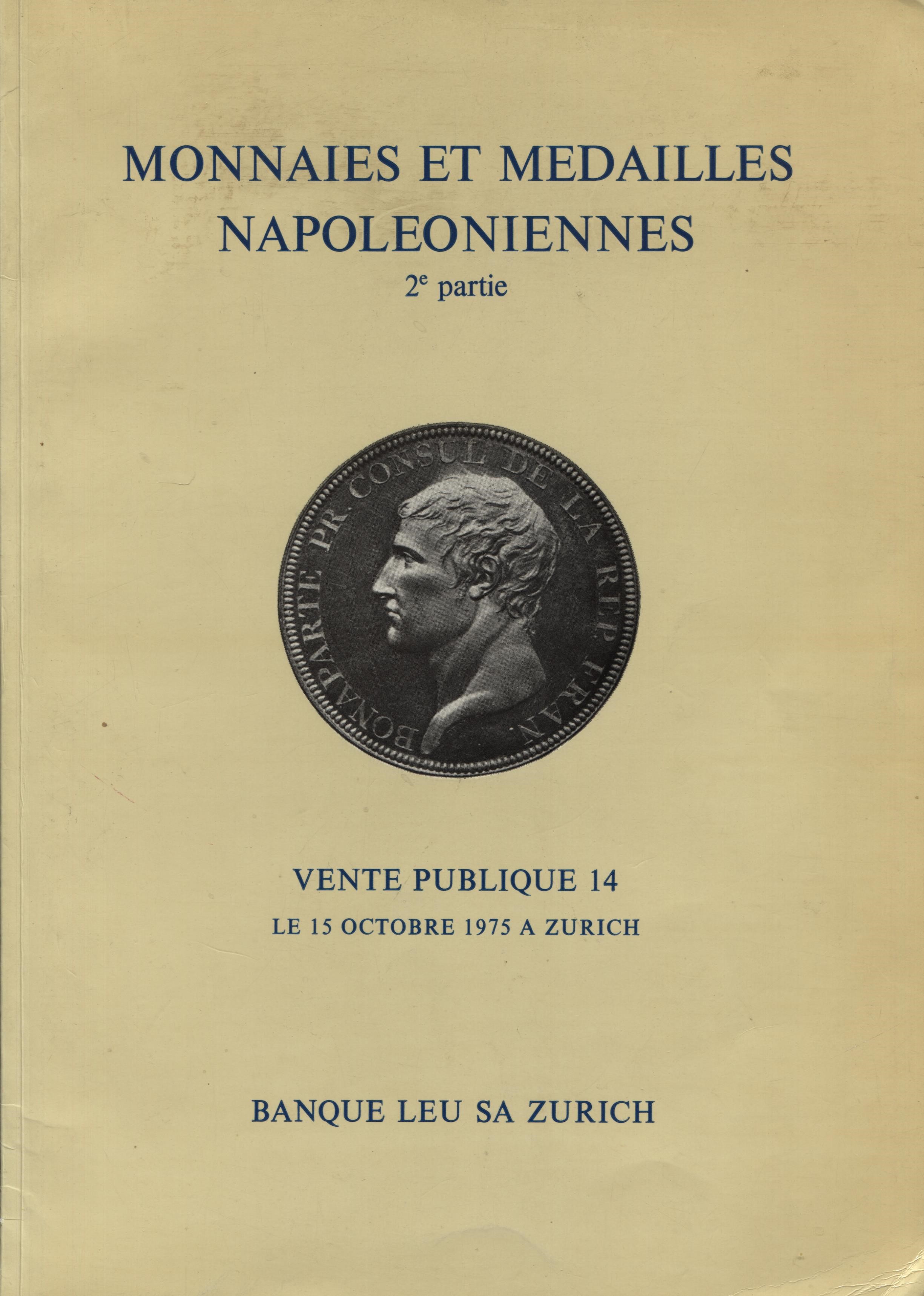 LEU BANQUE SA. Monnaies et Medailles napoleoniennes. 2 partie. Zurich, 15 - Octobre - 1975. pp. 62, nn. 580, tavv. 36, colori e b\n. ri. editoriale, buono stato, lista prezzi Val.