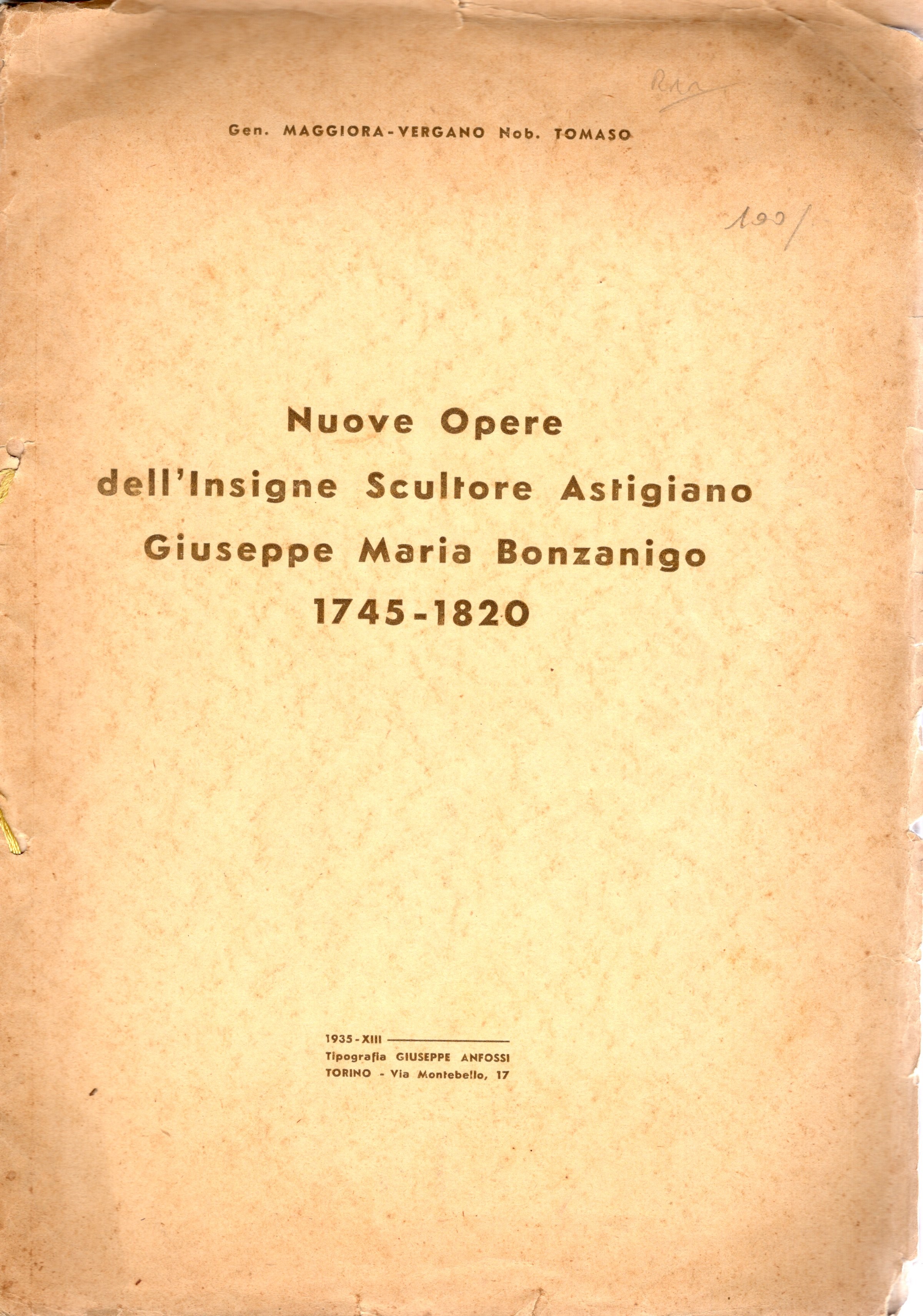 MAGGIORA - VERGANO Tommaso - Nuove opere dell'insigne scultore astigiano Giuseppe Maria Bonzanigo 1745 - 1820. Torino 1935. pp. 47, illustrazioni e tavole nel testo. raro, brossura editoriale sciupata, buono stato.Modesti, manca