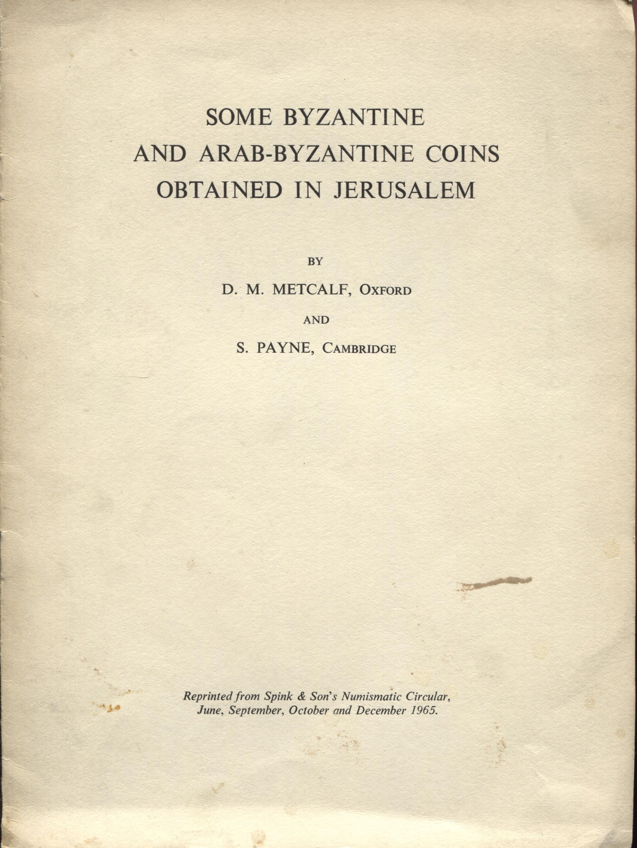 METCALF D.M. - PAYNE S. - Some byzantine and arab-byzantine coins obtained in Jerusalem. London, 1965. pp. 8, ill nel testo. brosssura ed. buono stato.