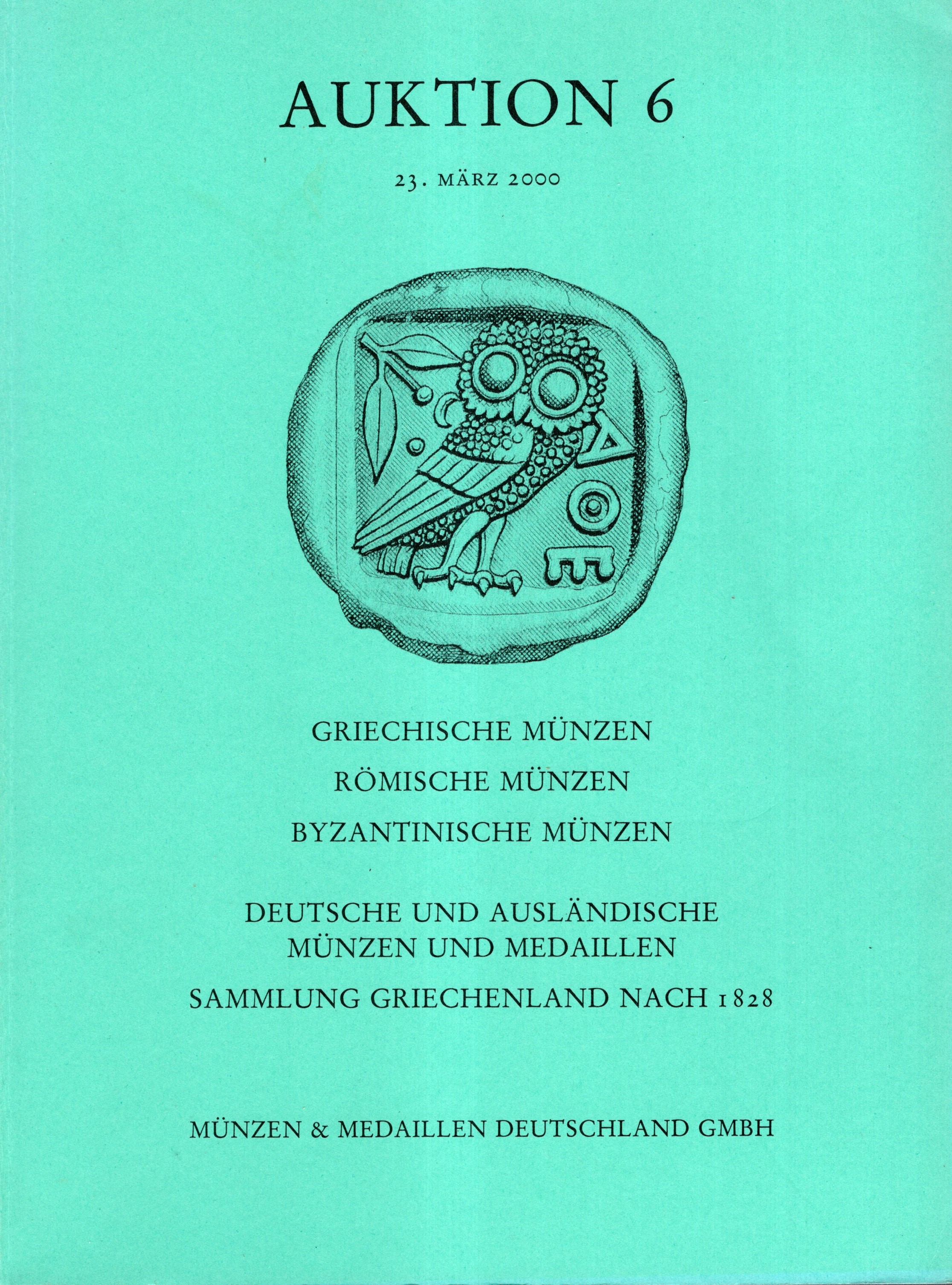 MUNZEN & MEDAILLEN DEUTSCHALAND. Auktion, 6. Stuttgart, 23 - Marz, 2000. Griechiche munzen, Romische munzen, Byzantinische munzen, Deutsche und auslandische munzen und medaillen, sammlung griechenland nach 1828. pp 70, lots 698, plates 35. Legatura ed. li