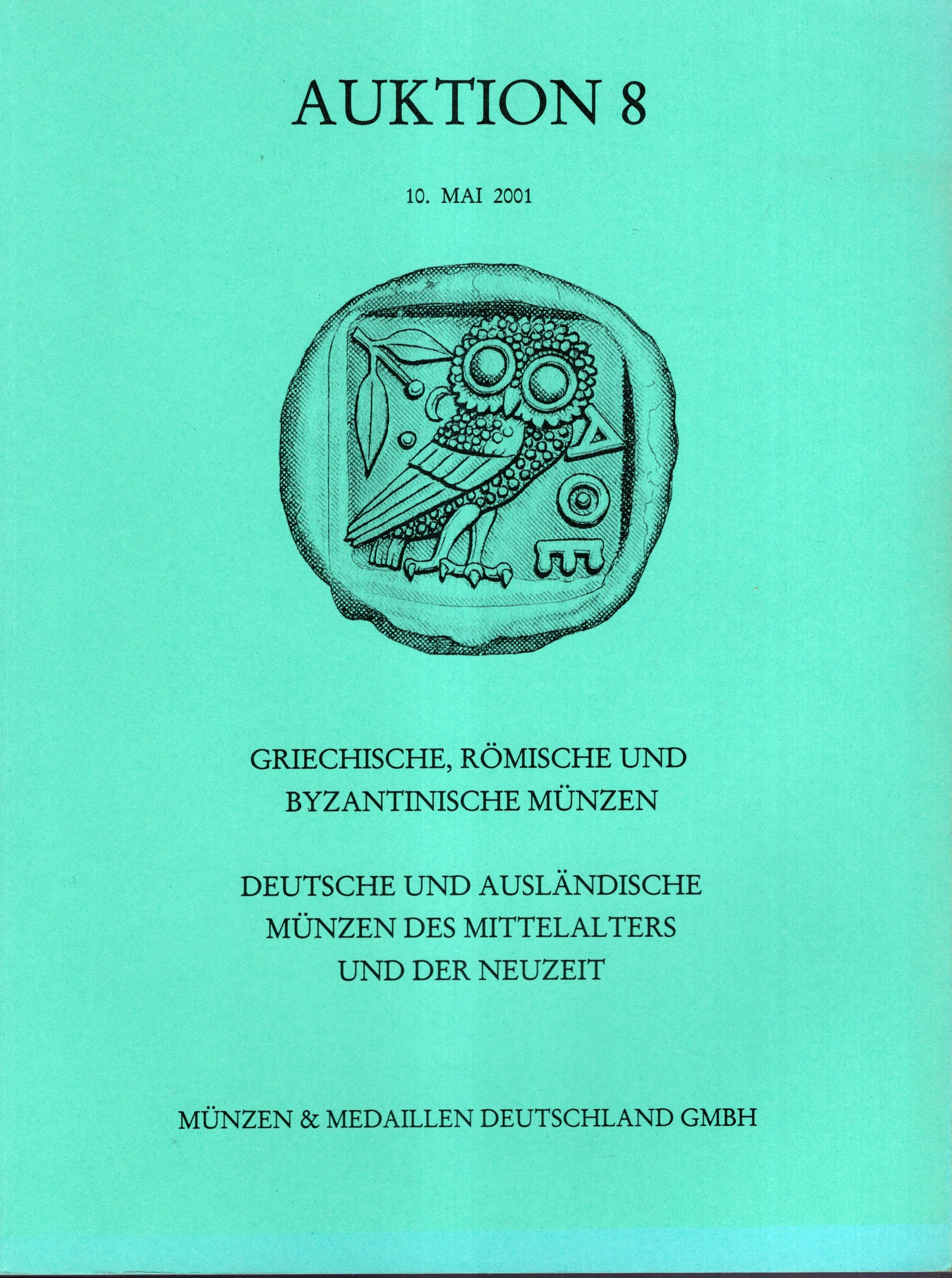 MUNZEN & MEDAILLEN DEUTSCHALAND. Auktion, 8. Stuttgart,10 - Mai, 2001. Griechiche munzen, Romische munzen, Byzantinische munzen, Deutsche und auslandischemunzen des mittelalters und der neuzeit. pp 88, lots 1012, plates 36 + 2. Legatura ed. ottimo stato.