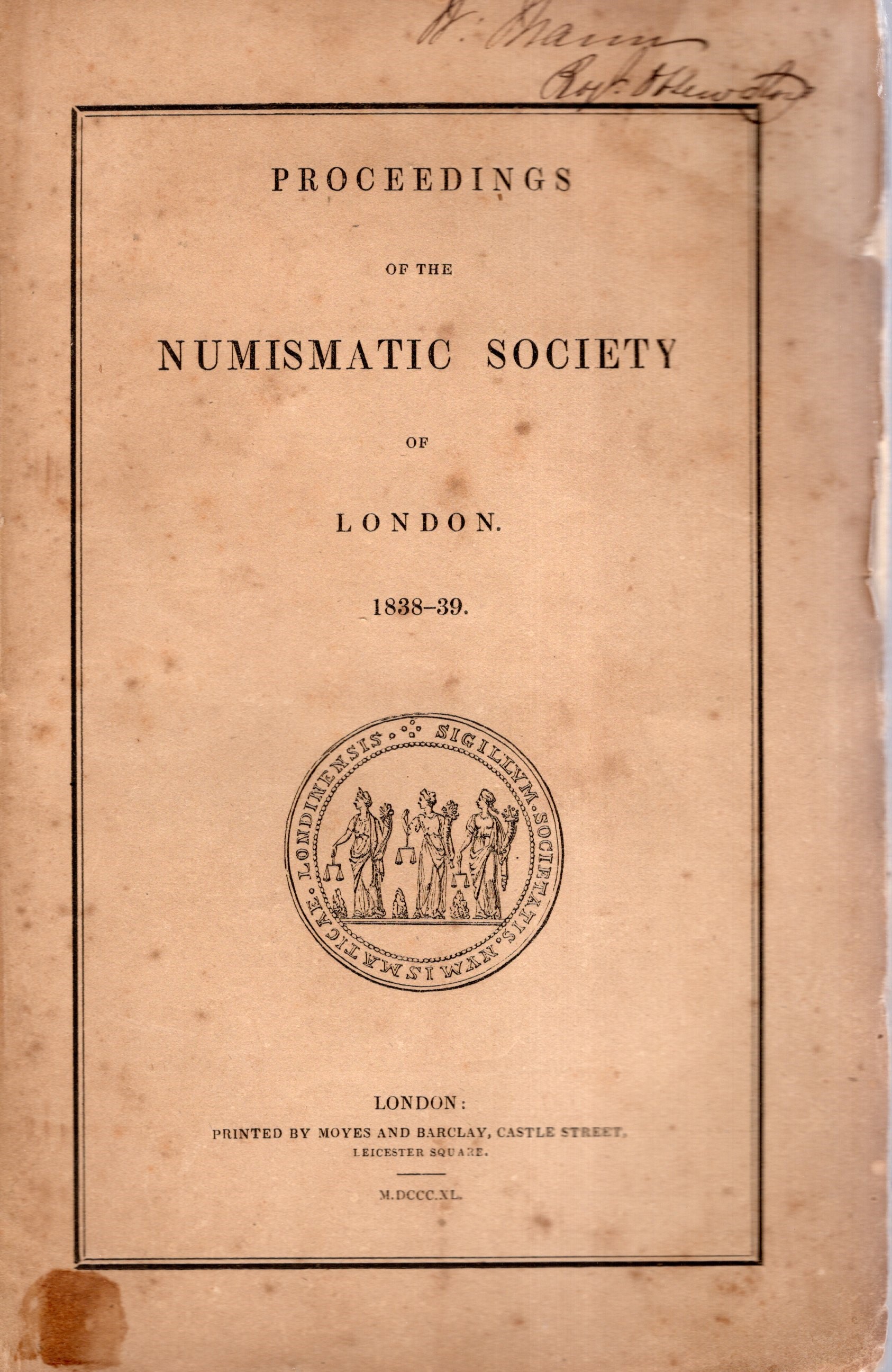 NUMISMATIC CHRONICLE - London, 1838-39. PROCEEDING of the Numismatic Society. Pp 355 - 439, plates 5. Legatura ed. sciupata, interno buono stato, molto raro.