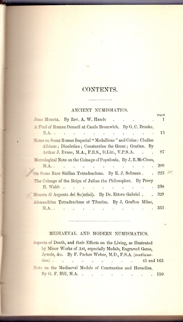NUMISMATIC CHRONICLE - London, 1910. completo. pp 484 + altre, plates 14 + illustrazioni nel testo. legatura rigida coeva con scritte sul dorso, interno ottimo stato, raro. Ex libris, importanti lavori fra cui un lavoro del Seltman sui Tetradrammi siciliani