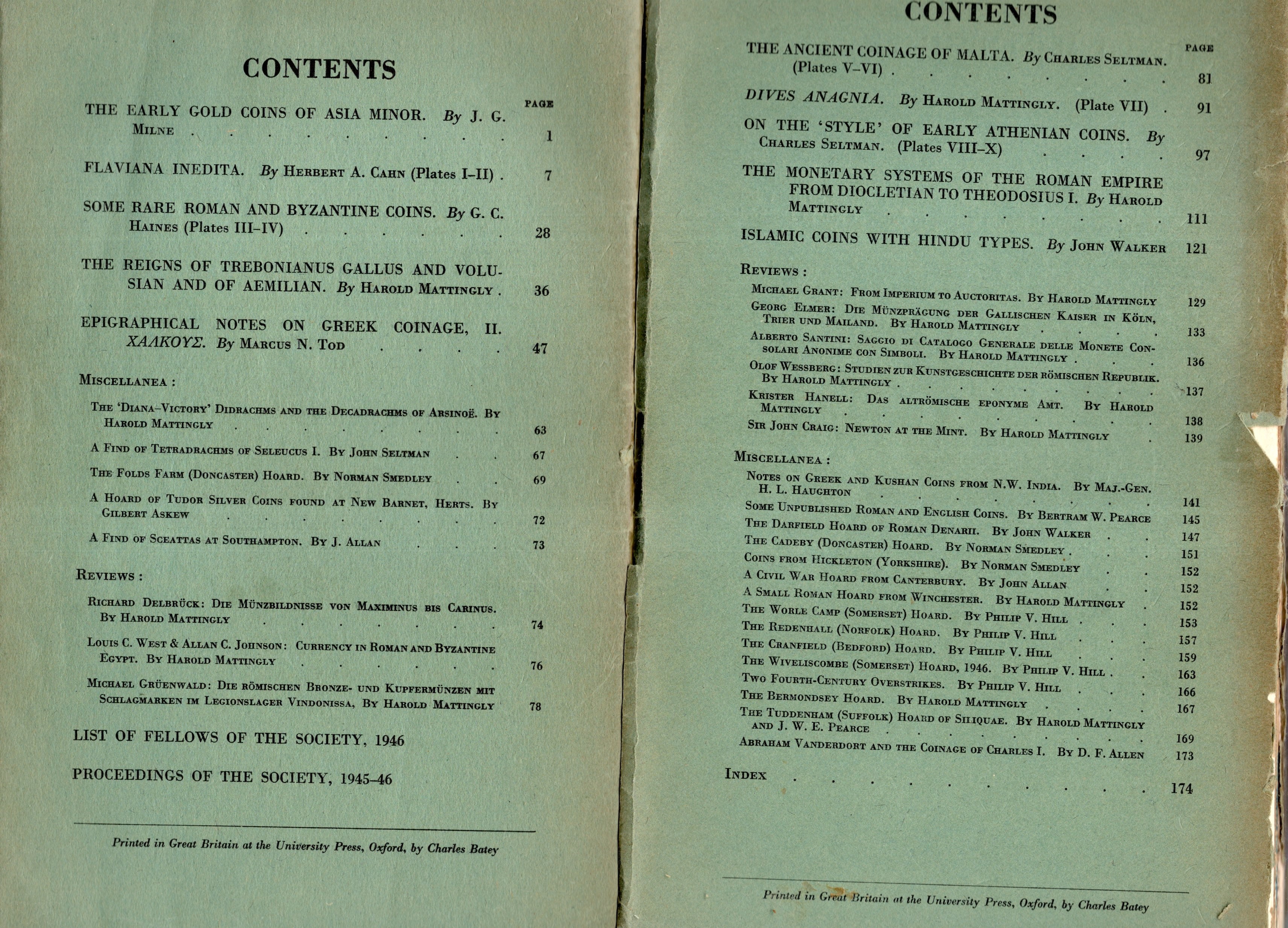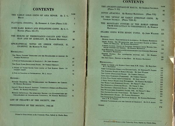 NUMISMATIC CHRONICLE - London, 1946. parts I-II - III-IV. Completo. 2 fascicoli. Pp 176 + altre, plates 10. Legatura ed sciupata, interno buono stato, molto raro e importante