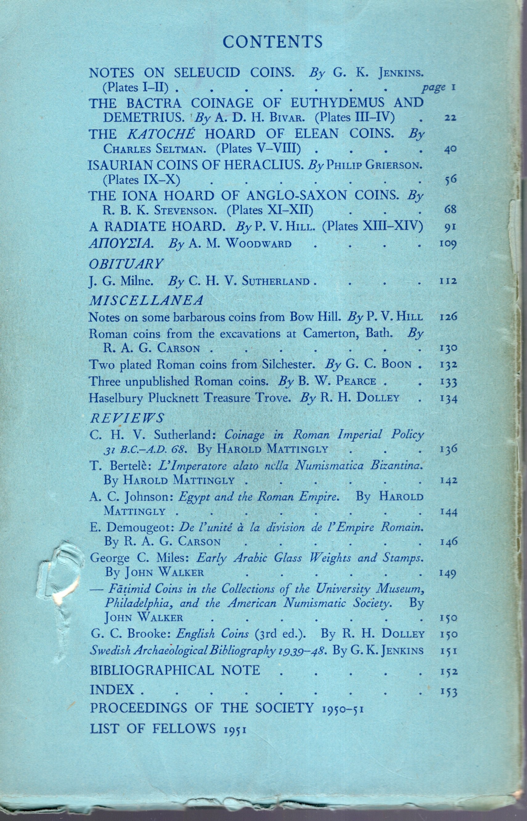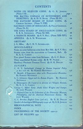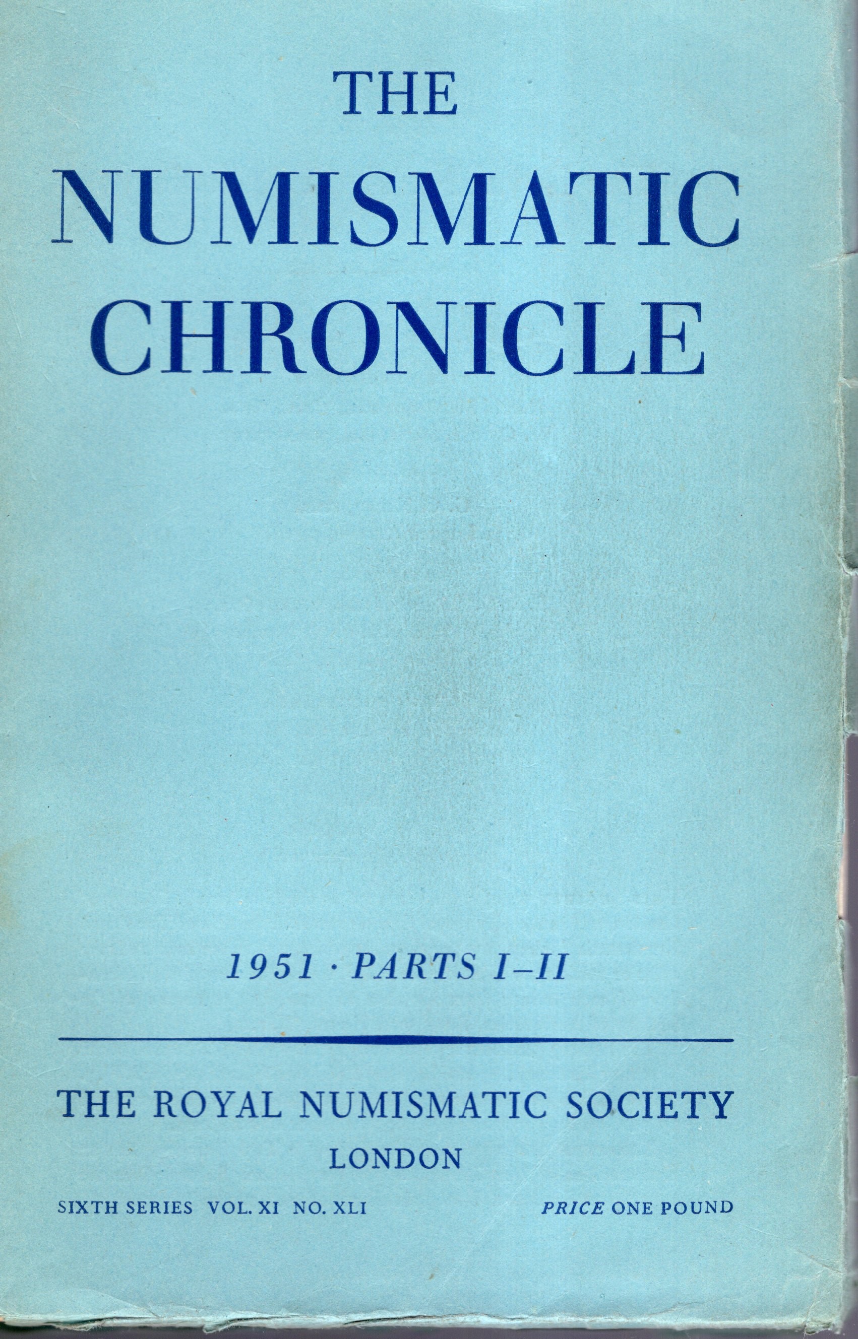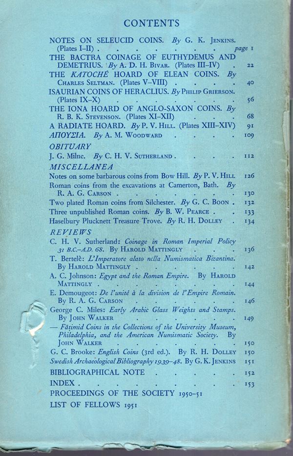 NUMISMATIC CHRONICLE - London, 1951. parts I-II completo. pp 156 + altre, plates 14. Legatura ed. sciupata, interno buono stato.