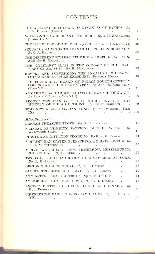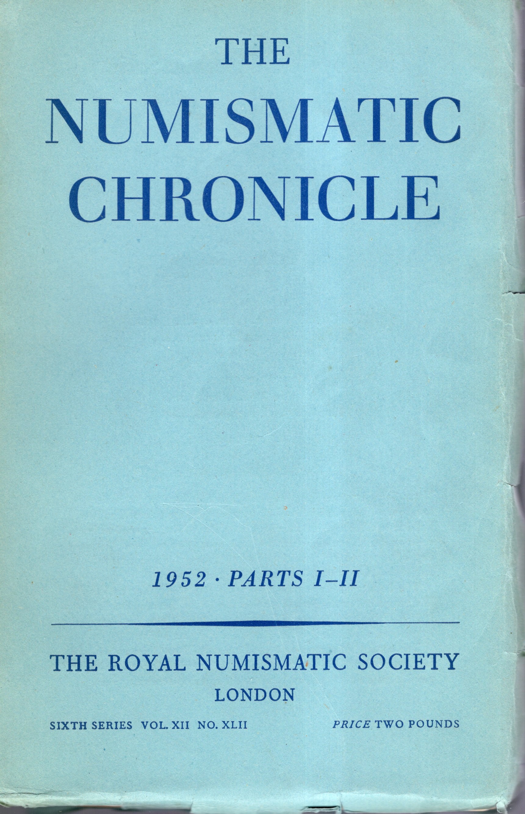 NUMISMATIC CHRONICLE - London, 1952. parts I-II completo. pp 175 + altre, plates 9. Legatura ed. sciupata, interno buono stato. contiene fra l'altro un lavoro dello Whittings su contromarche siciliane.