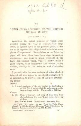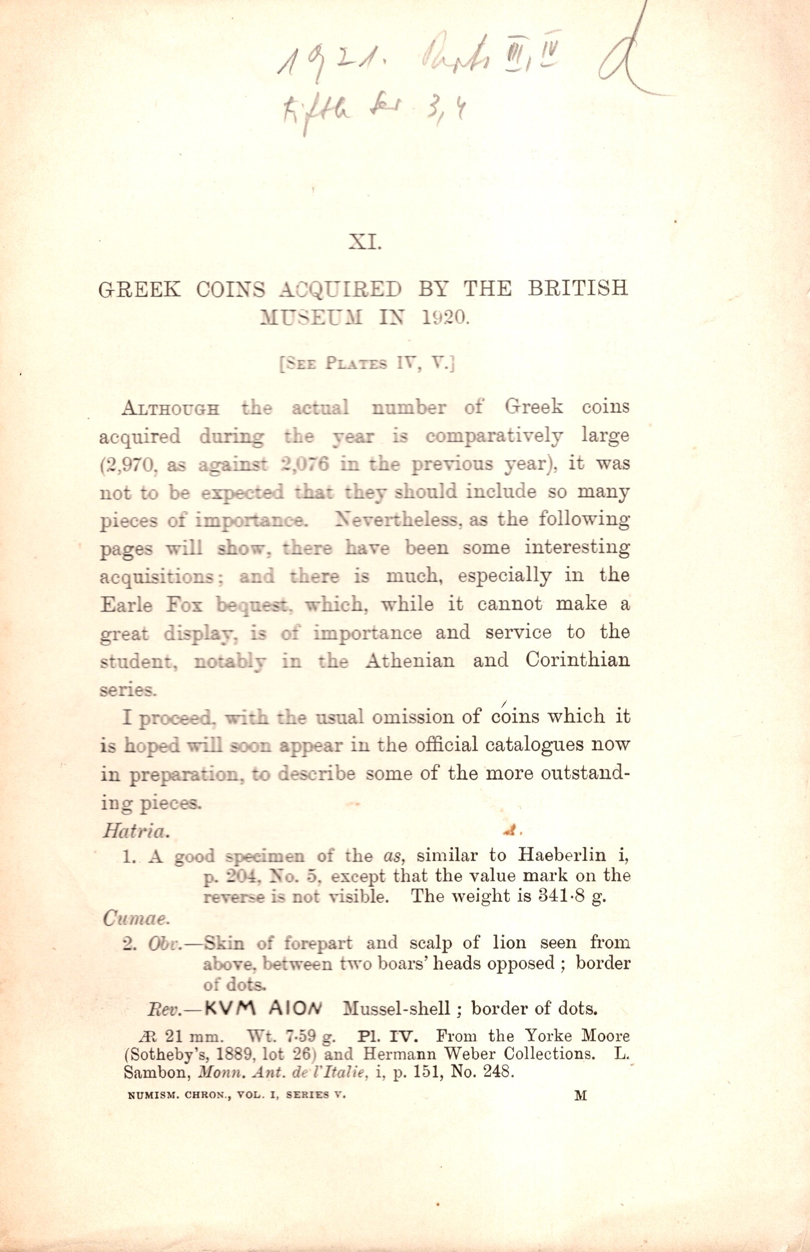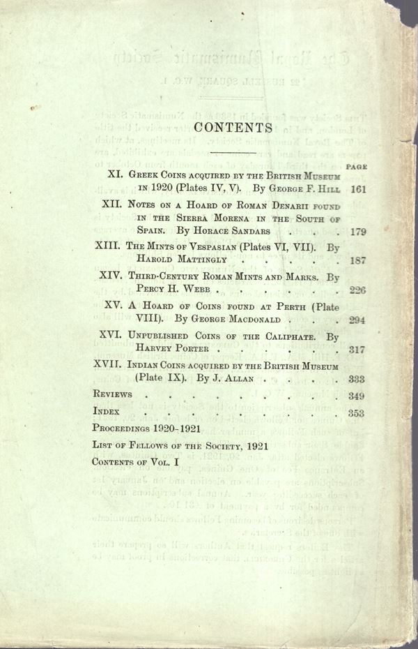 NUMISMATIC CHRONICLE - London, part III - IV 1921. Pp 161- 336,+ altre, plates 6 Legatura ed, sciupata, manca la brossura anteriore,interno buono stato, molto raro