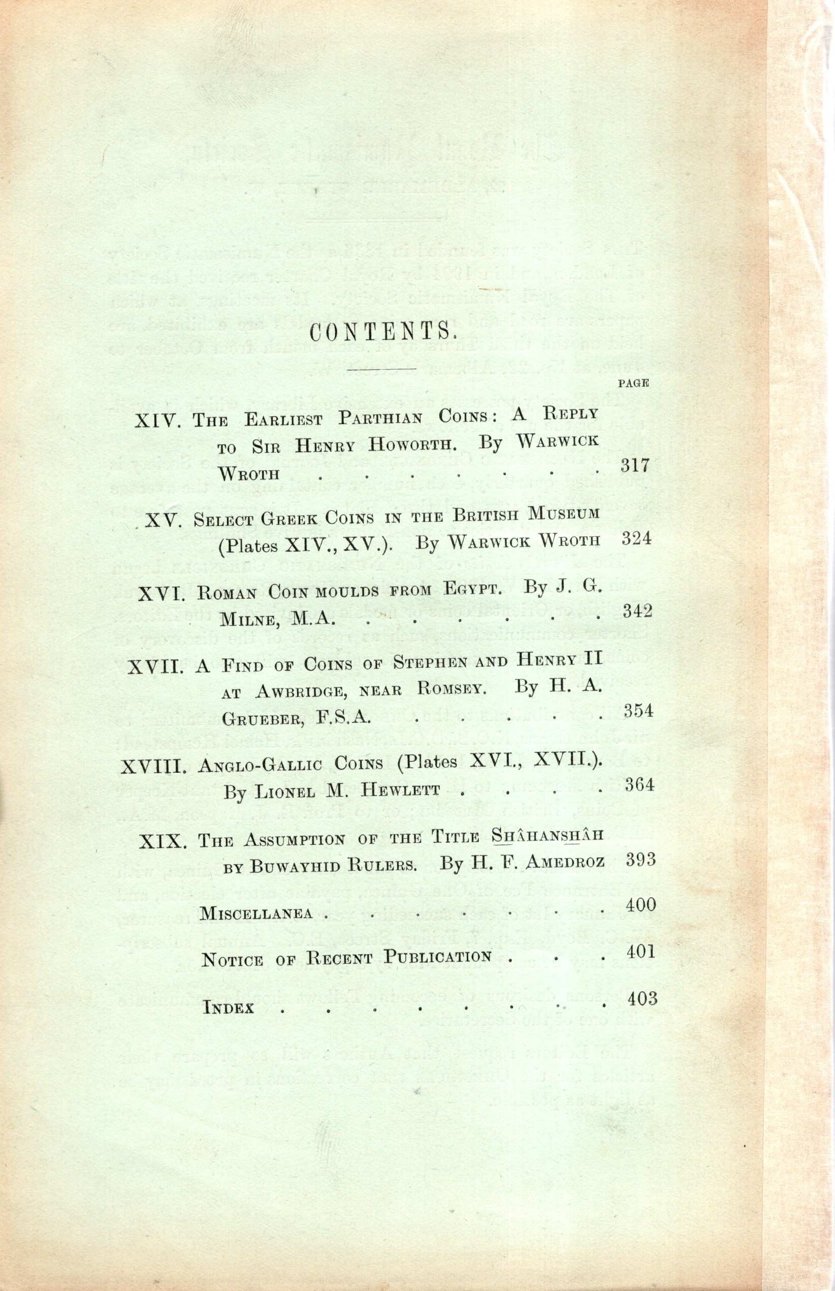 NUMISMATIC CHRONICLE - London, Part IV - 1905. pp 317-407+16, plates 3. Legatura ed. sciupata, interno ottimo stato, raro