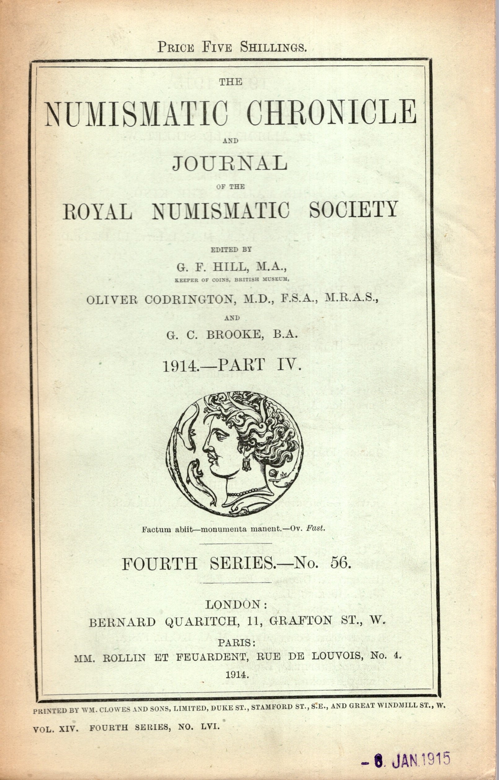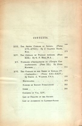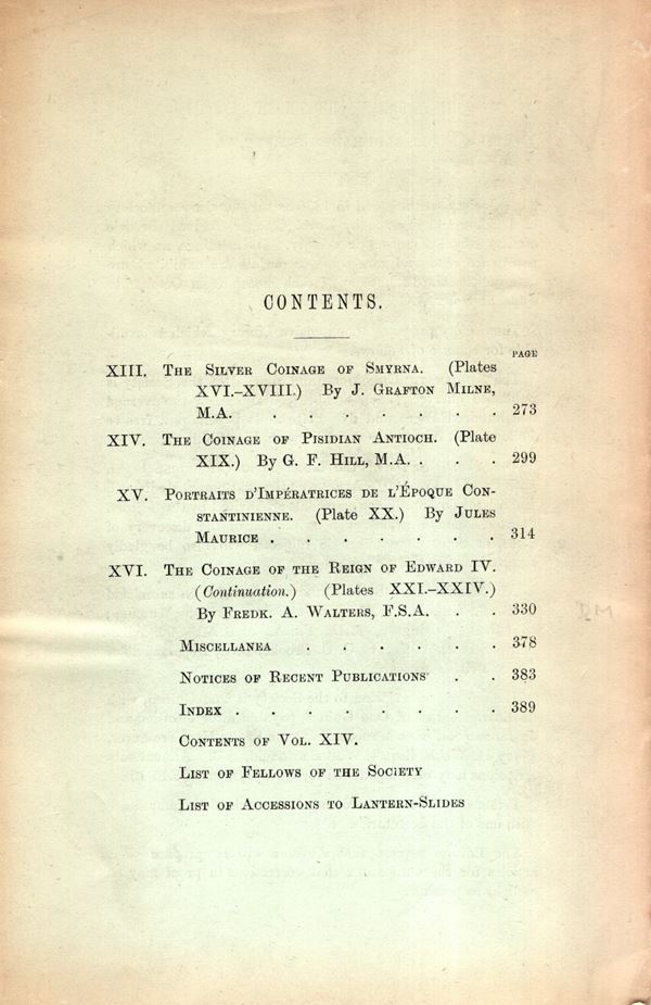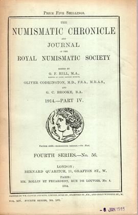 NUMISMATIC CHRONICLE - London, Part IV - 1914. pp 273-394 +16, plates 9. Legatura ed. sciupata, interno ottimo stato, raro