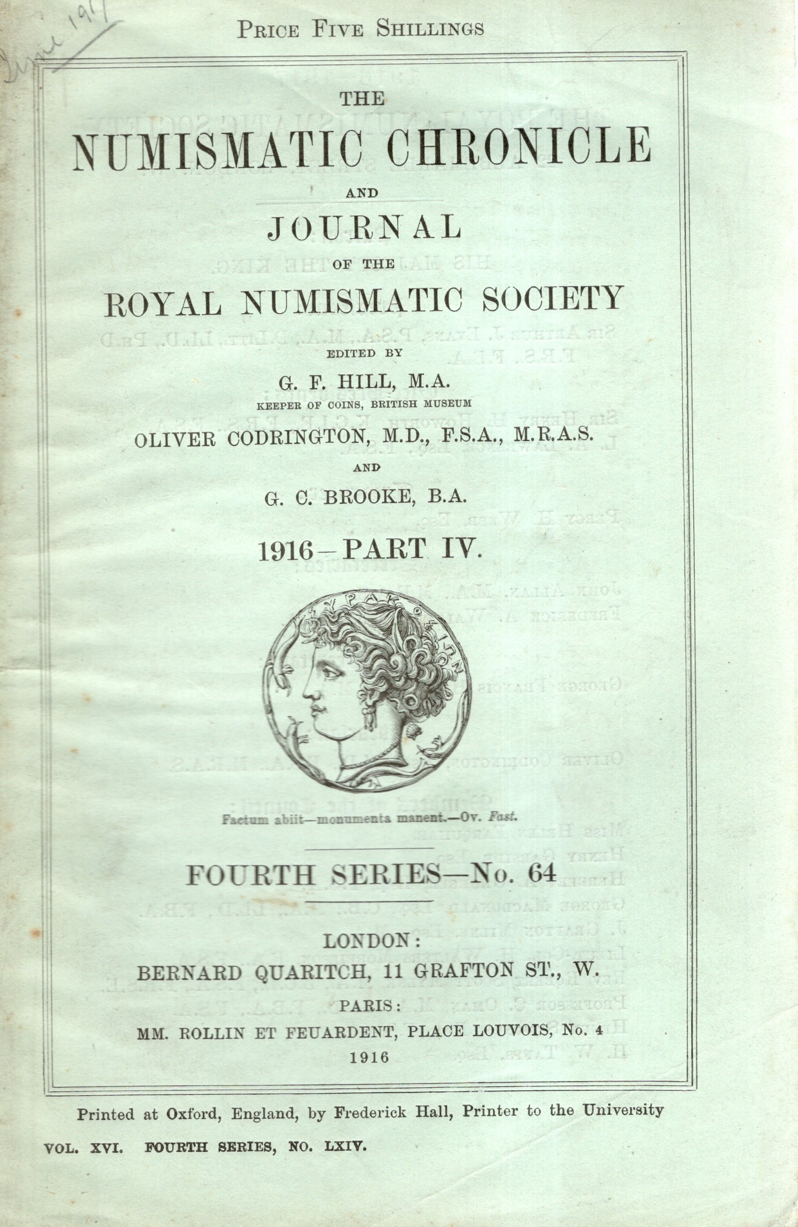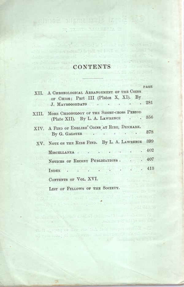 NUMISMATIC CHRONICLE - London, Part IV - 1916. pp 282-416 + 16, plates 3. Legatura ed. sciupata, interno ottimo stato, raro e importante