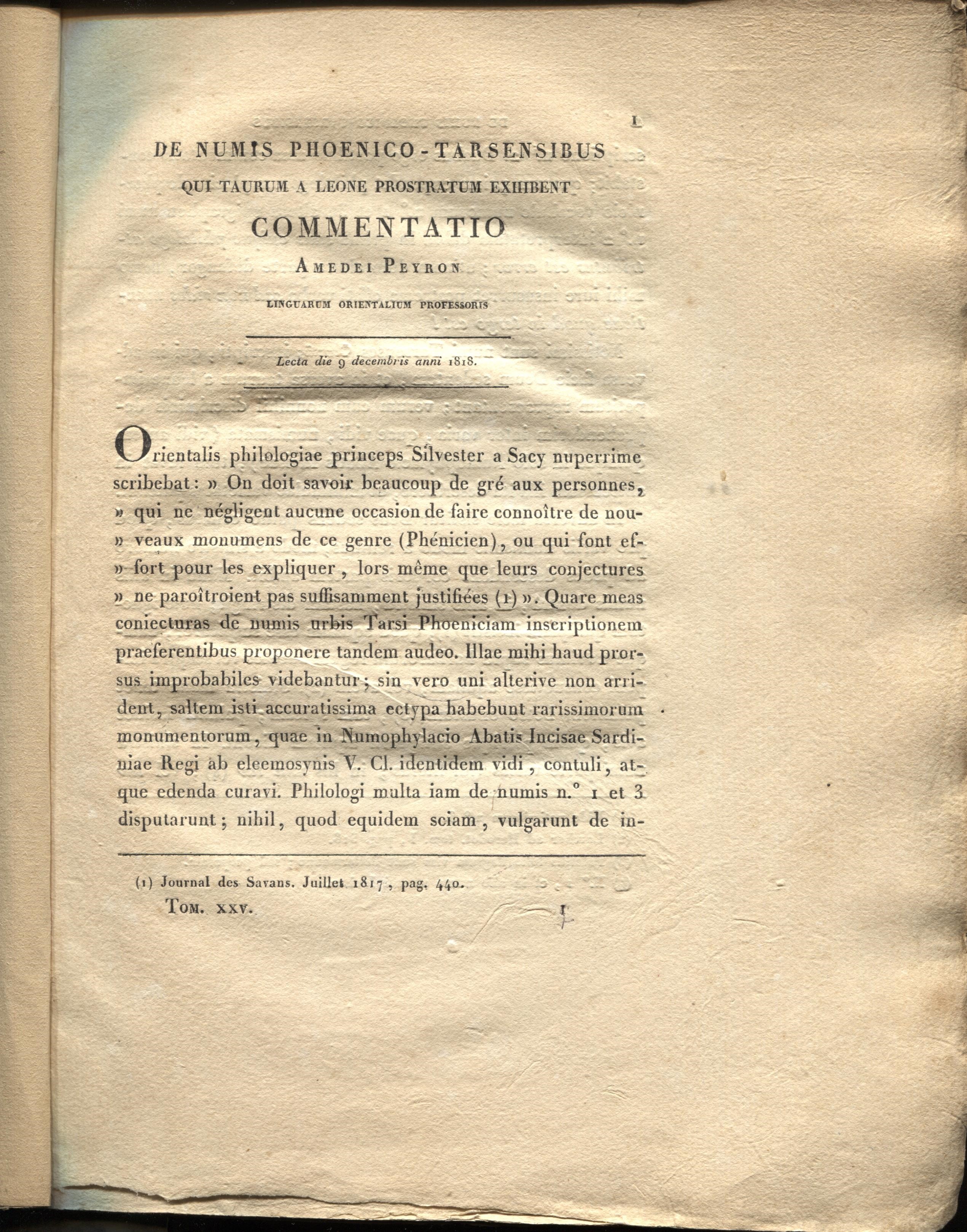 PEYRON A. - De Numis phoenico –tarsensibus qui taurum a Leone prostratum exhibent. Torino, 1818. Pp. 26, tavv. 1. Brossura, muta intonso buono stato, raro.