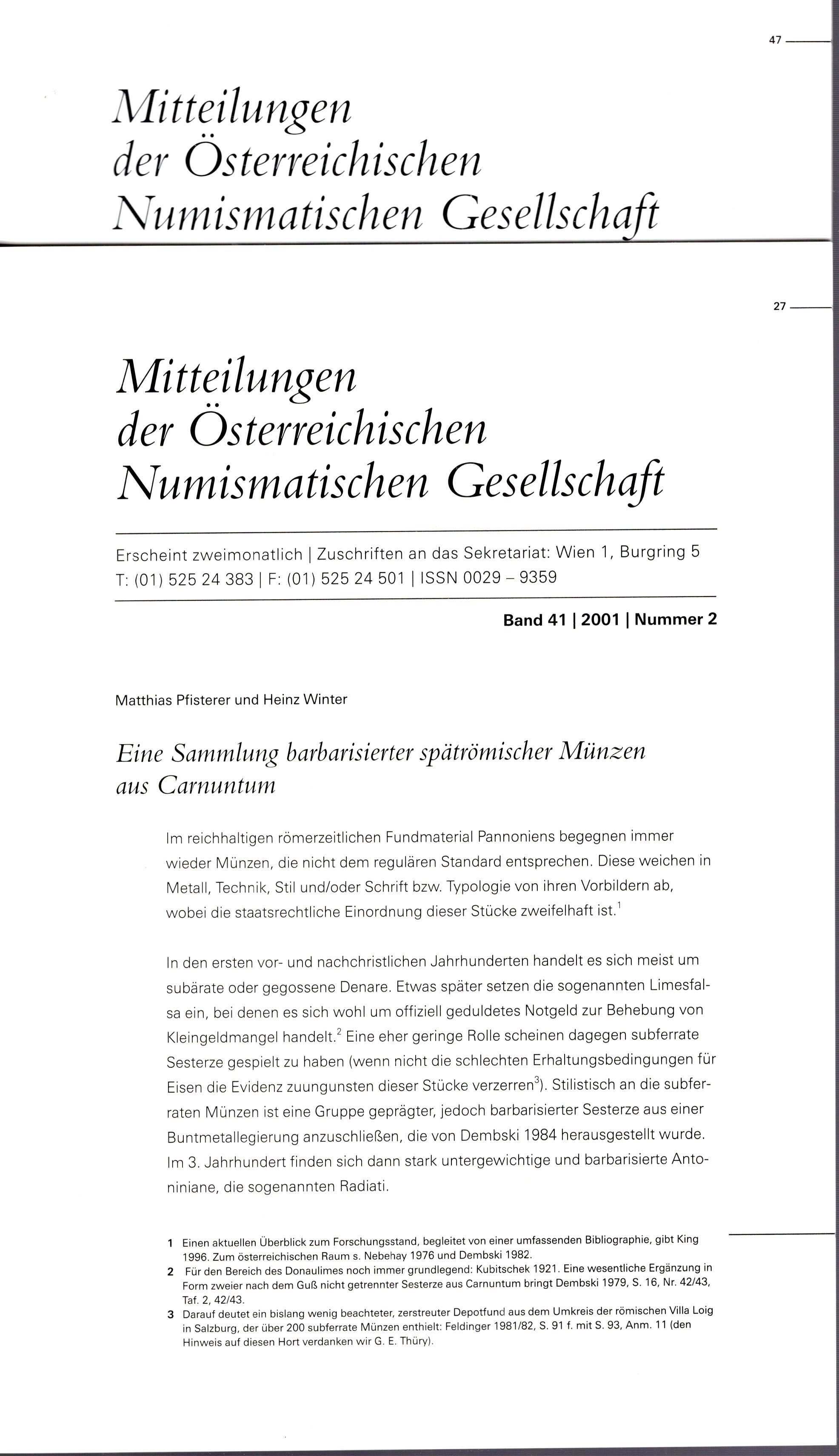 PFISTERER Matthias-WINTER Heinz. Eine sammlung barbarisierter spatromischer munzen aus Carnutum. 2 fascicoli completo.Wien, 2001. pp 27- 41, tavole 4 + pp 47-61, tavole 1. brossura editoriale, ottimo stato. importante lavoro degli autori sulle imtazioni di monete romane da parte dei popoli barbari.
